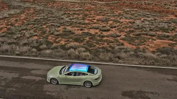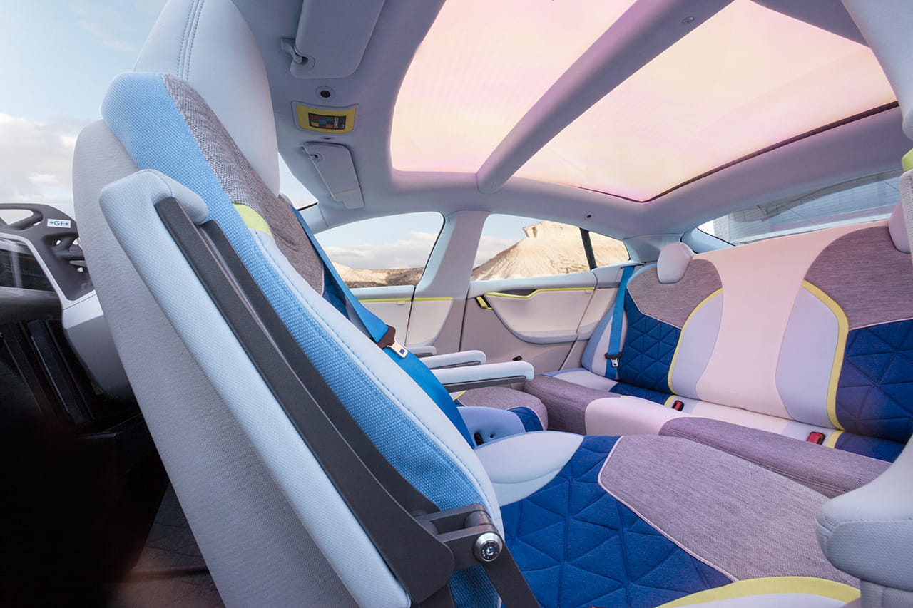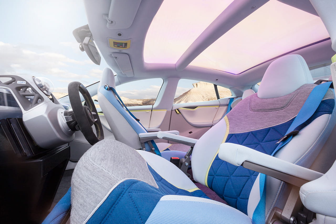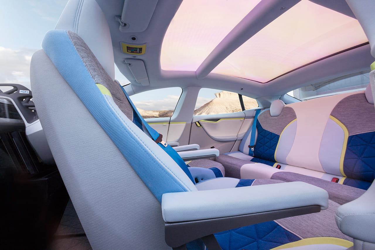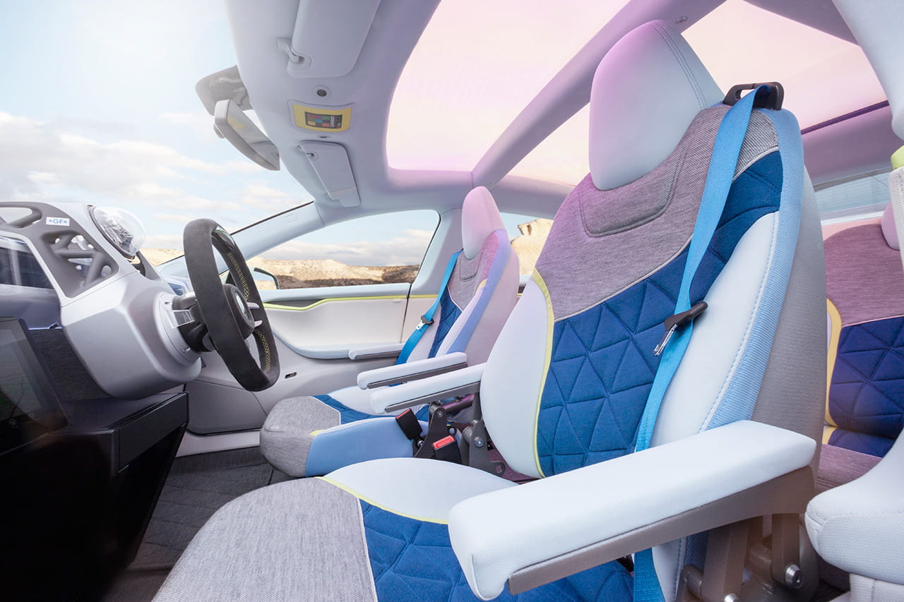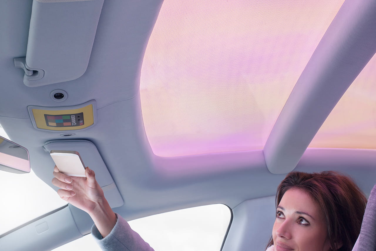 Rinspeed también ha aprovechado para utilizar una tecnología de techo de Plexiglass e iluminación LED desarrollada por Evonik Industries, que permite cambiar la atmósfera del coche con 358 tonos diferentes.
