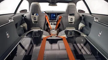 Una vista desde la parte posterior del habitáculo nos revela también una curiosa superficie acristalada, unos asientos deportivos con una también curiosa disposición para los cinturones y unos asientos posteriores que parecen plegados, dejando de nuevo claro el empeño en el cuidado de los materiales como bien refleja el tejido de la parte posterior de los asientos y el cuero que recubre toda la superficie media de los laterales.