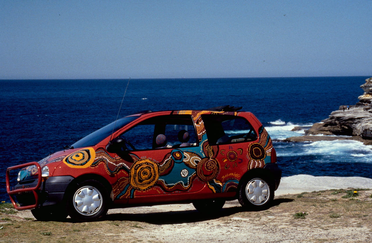 Dicen que en 1994, un intrépido francés, ya había recorrido con su Twingo más de 240.000 kilómetros por la sabana australiana. Y para celebrarlo un artista aborigen le decoró su máquina de esta guisa.
