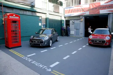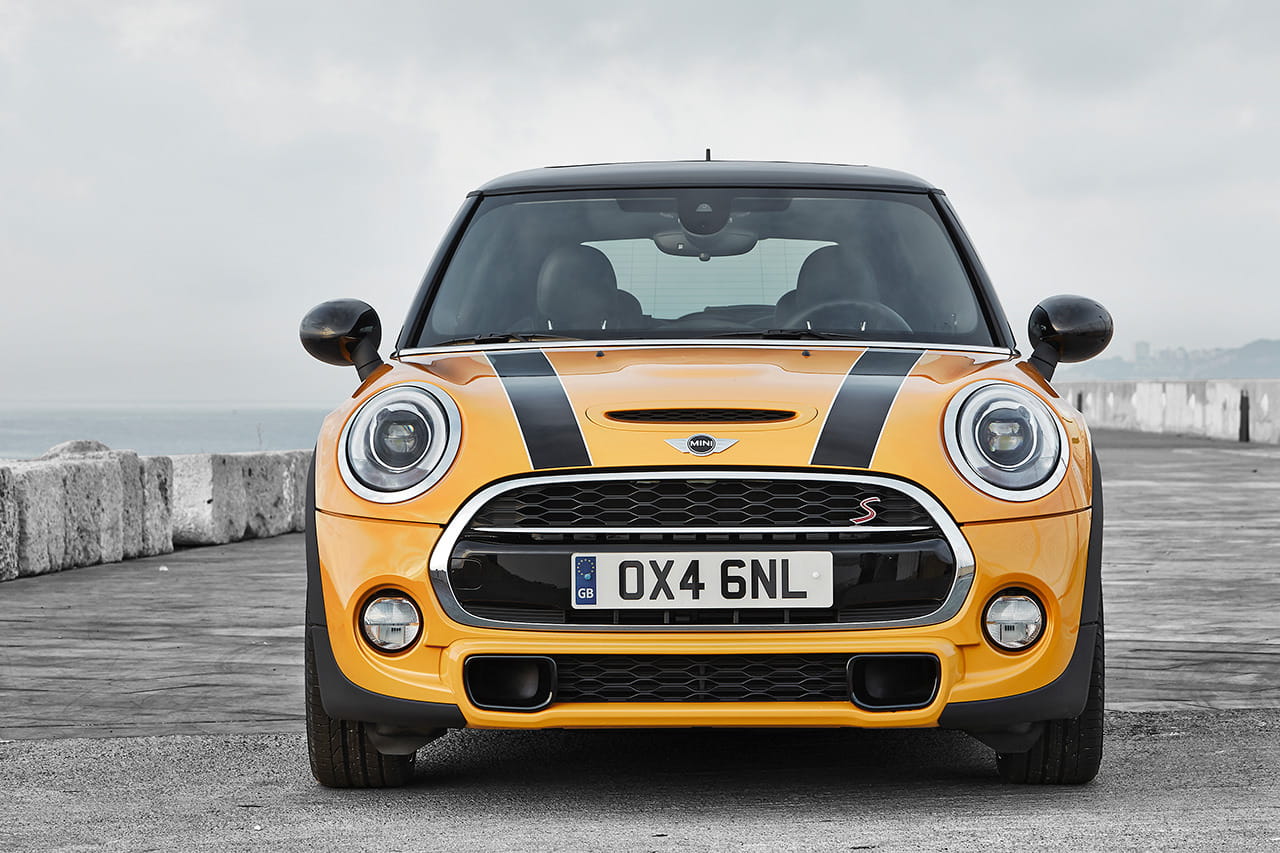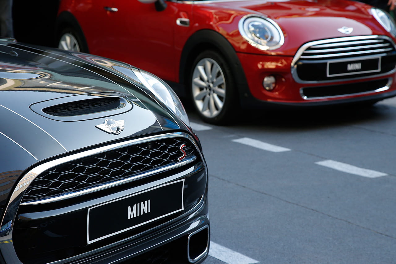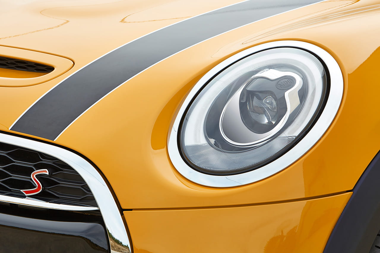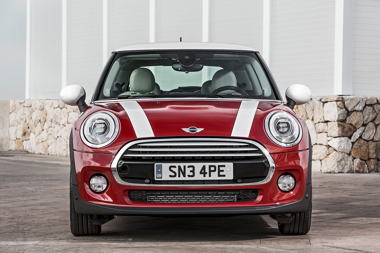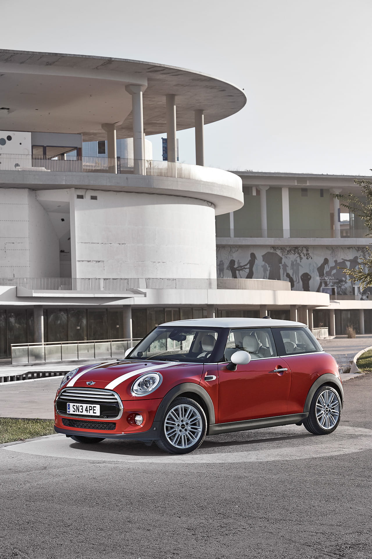 Nótese las diferencias en el diseño del frontal del MINI Cooper y el Cooper S. El Cooper en rojo, con techo y franjas blancas, es realmente atractivo, pero no puede competir en estética deportiva con la parrilla de nido de abeja del Cooper S…