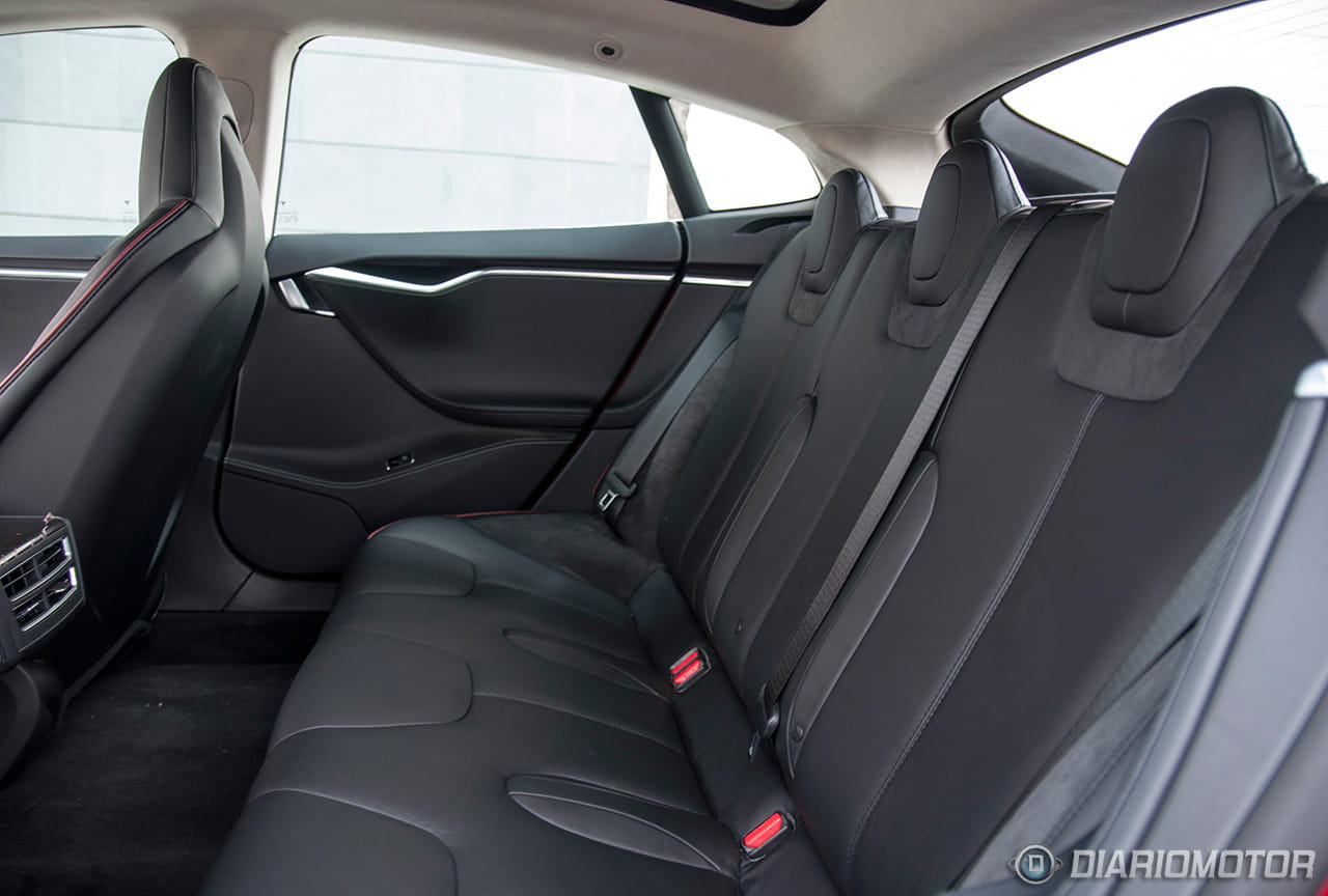 Las plazas traseras tienen bastante espacio para las piernas y tres reposacabezas. Como no hay eje hacia el tren trasero, no hay túnel central, pero la base es muy baja con respecto al suelo y te obliga a viajar con las piernas estiradas. La altura con respecto al techo también es demasiado baja para una berlina de 5 metros. Son fallos importantes que nos recuerdan que este Tesla Model S es humano y aunque no alcance la perfección está cerca de ello.