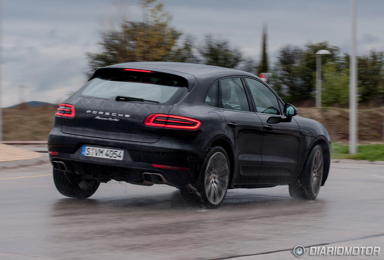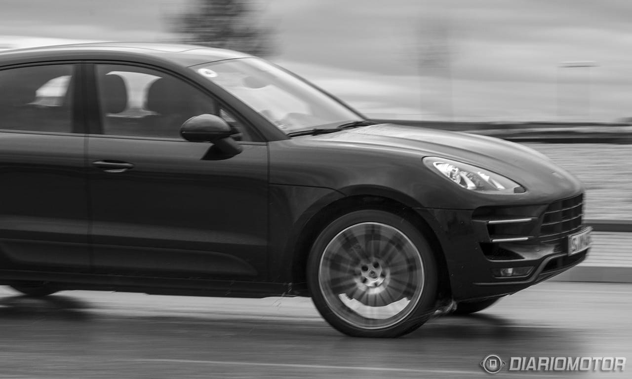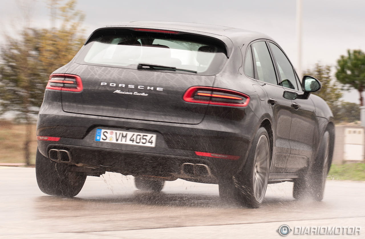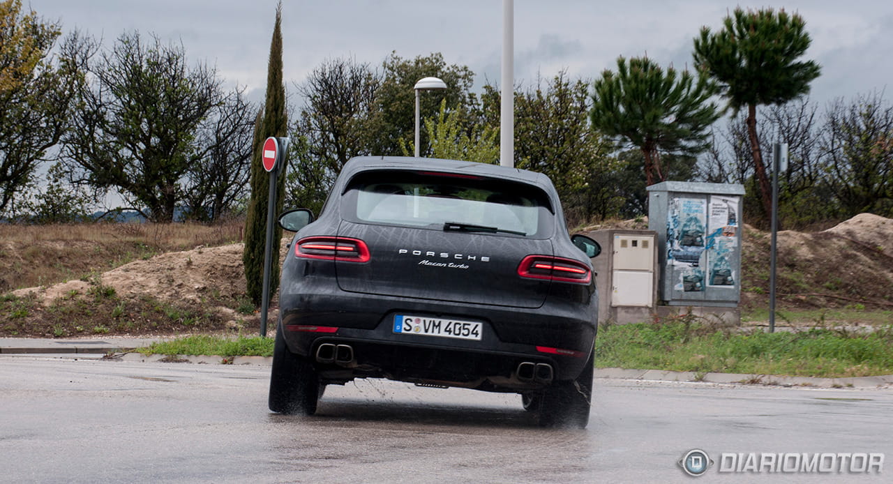 Primera prueba de agudeza visual. ¿Cómo diferenciámos un Porsche Macan S de un Macan Turbo a simple vista? El Macan Turbo se diferencia, entre otras cosas, por dos parejas de salidas de escape trapezoidales, una a cada lado y el diseño de la parrilla con unos cromados en las entradas de aire laterales y la iluminación diurna en una posición más baja. La foto que ves más arriba nos muestra un Porsche Macan Turbo con ruedas de 21” que escupen el agua acumulada en los inmensos charcos que se han formado tras una mañana en la que no ha dejado de llover. Casi nada.