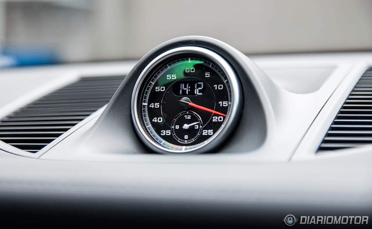 Como en el resto de la gama Porsche, de los tres diales del cuadro de mandos, el derecho se ha transformado en una pantalla a todo color que nos ofrece la información que queramos contemplar en cada momento, navegando por un sencillo menú pilotado desde el volante, desde la distribución de par entre ejes del diferencial central o la presión de los neumáticos hasta las indicaciones del navegador.