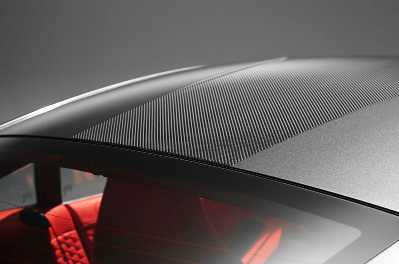 Contribuyendo al contraste del carbono sobre la carrocería gris aparecen unas llantas en negro con las pinzas de freno en rojo, adelantando el acabado que nos encontramos en su interior.