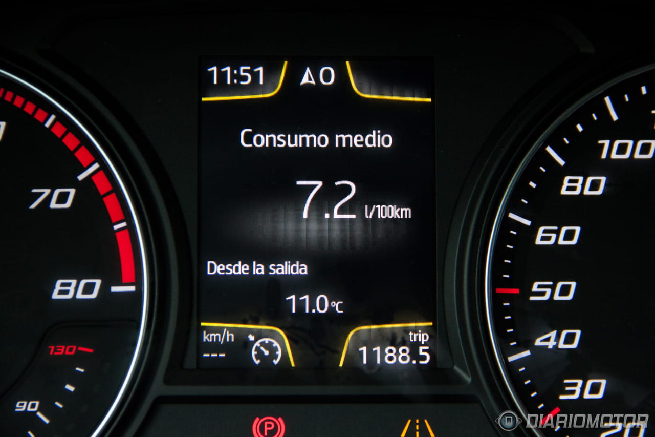 Desde Madrid a Herencia (Ciudad Real), quise hacer un experimento. A una velocidad de entre 100 y 105 km/h, rodando muy tranquilo, conseguí un consumo medio de sólo 4,7 l/100 km. Desde Herencia hasta Gijón (casi 650 km, incluyendo dos puertos de montaña y a 120 km/h de control de crucero) el consumo sólo ascendió hasta los 5,7 l/100 km. El depósito tiene una duración real de unos 850 km, una autonomía impresionante.