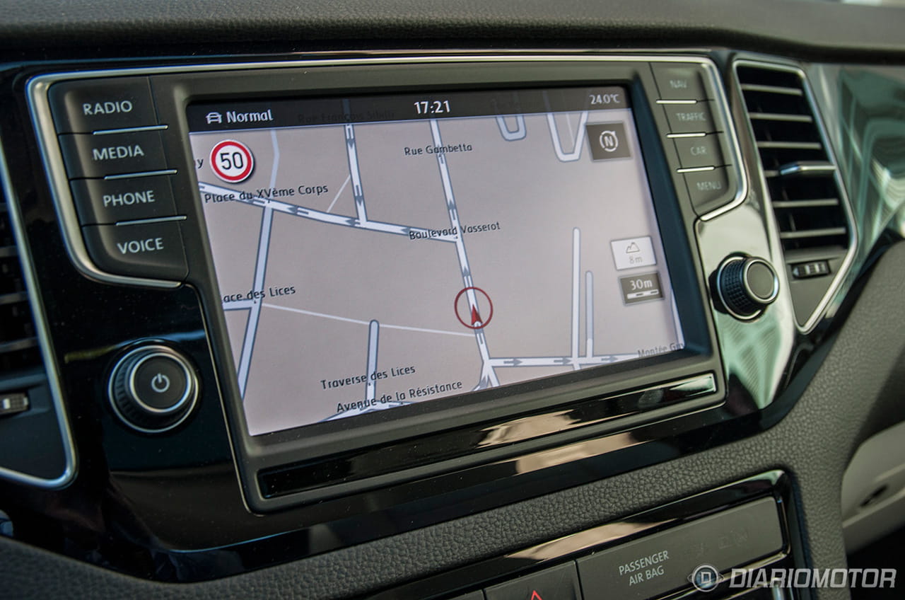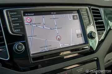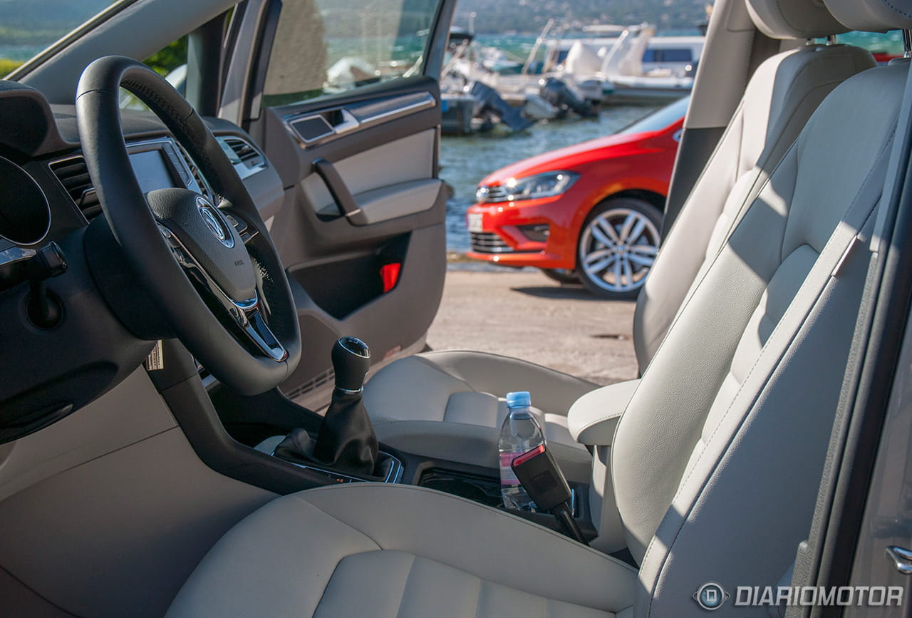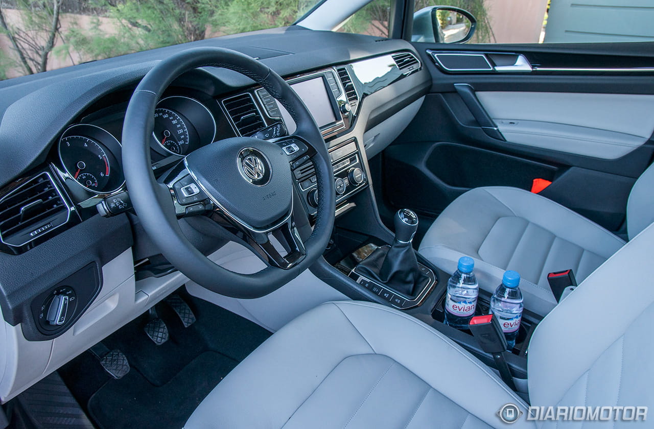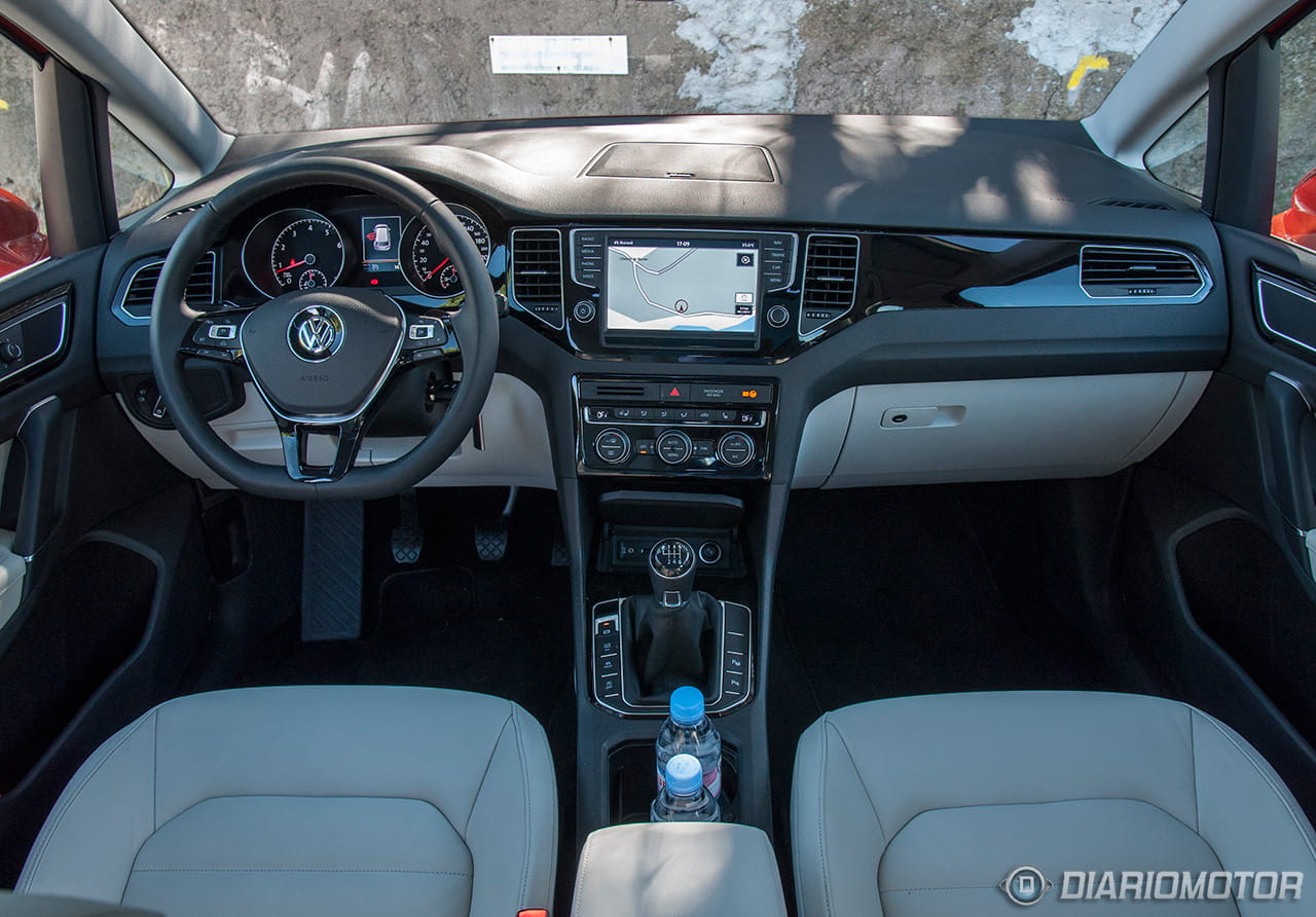 A bordo del Volkswagen Golf Sportsvan, te sientes exactamente como en un Golf. Todos los ajustes son correctos y la calidad de los materiales está a un buen nivel. La mayor diferencia estriba en que el área central del salpicadero no está tan orientado hacia el conductor y la pantalla de 5,8 pulgadas (u 8 pulgadas con el equipo Discover Pro) del equipo de entretenimiento se ha situado en la zona superior, en una posición muy visible y a la vez cómoda.