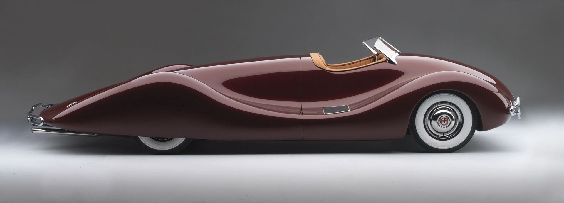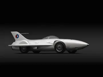 Uno de ellos es el “L’Oeuf electrique“, un diseño del ingeniero y artista Paul Arzens construido en Francia en 1942. El “Huevo eléctrico” fue creado por el propio Arzens para moverse por la ciudad en tiempos de restricción de energía y, visto hoy, bien parece un proyecto futurista de los creados por el MIT Media Lab. En un contexto diferente se encuentran el Norman Timbs y el Tasco, de 1947 y 1948 respectivamente, creaciones individuales que cabalgan entre el estudio de la aerodinámica de los años 30 y el de la aeronáutica de los años 50. Sin embargo quizá el más interesante de este periodo en la exposición sea el precioso Chrysler Thunderbolt de Alex Tremullis (1941). Tremullis pasa por ser un diseñador no demasiado conocido, pero en su currículum constan dos coches que son hitos de la historia del automóvil y de la cultura popular: el Cord 810 y el Tucker. El extraplano Thunderbolt bien parece ser un coche salido de un capítulo de los “Supersónicos“…