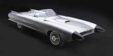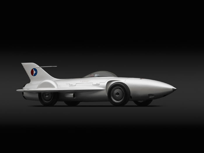 En “Dream Cars” esta era fundamental está representada por cinco coches simplemente fascinantes: del enorme equipo de Harley Earl en GM proceden el precioso y bajísimo Le Sabre XP1 de 1951, el Buick Centurion de 1956 y el Cadillac Cyclone de 1959 (con sus conos – radar de proximidad en el frontal). El cuarto es uno de los tres Firebird construídos, el XP21 de 1953, un auténtico avión reactor con ruedas que representa, para bien y para mal, la cumbre del diseño futurista en Estados Unidos en aquella época. Por mucho que Chrysler fuera un grande, las dimensiones de GM eran sencillamente incomparables (en 1964 las ventas de GM en el mundo igualaban el PIB de Francia), de ahí que el trabajo de Virgil Exner en la marca siempre quedase ensombrecido por el apabullante volumen de trabajo del equipo de Earl. Pero el hermoso e irreal Chrysler Streamline “Gilda” de 1955, es una maravillosa y realista aproximación a la aerodinámica moderna con un toque de estilo aportado por el carrocero Ghia y su diseñador Giovanni Savonuzzi. El coche fue bautizado, en efecto, en homenaje al personaje de Rita Hayworth en la película de Charles Vidor (1946).