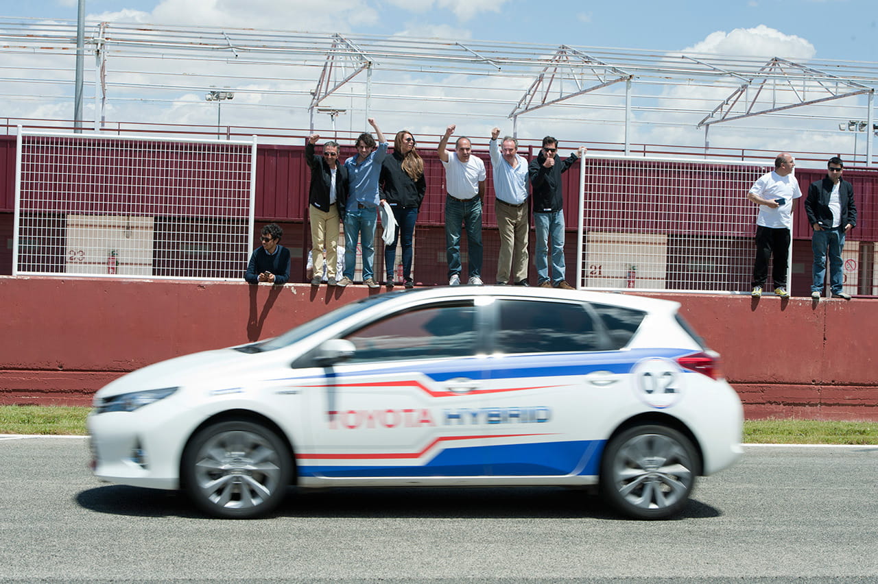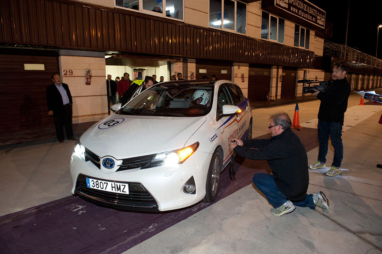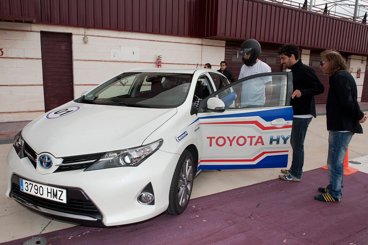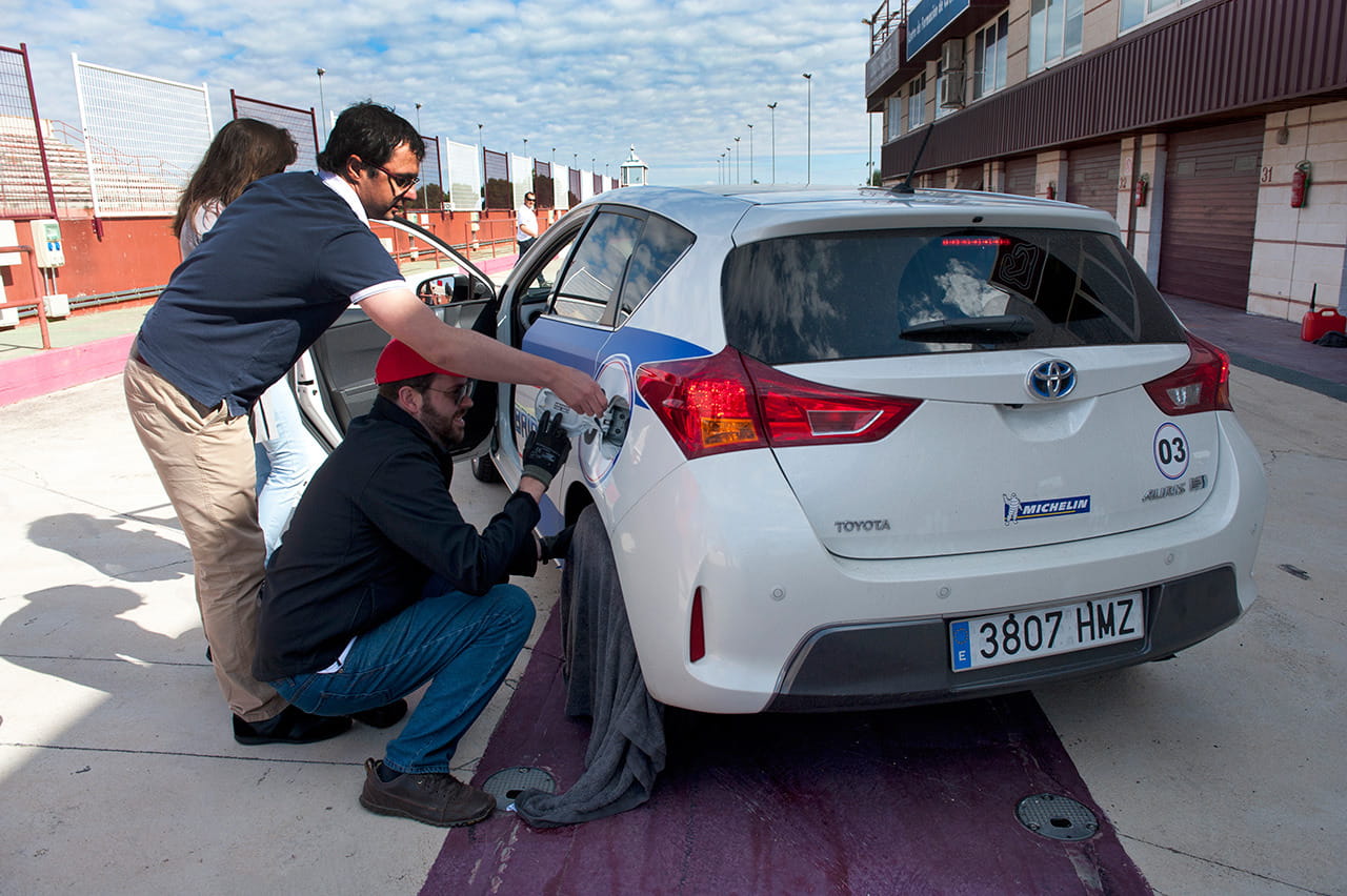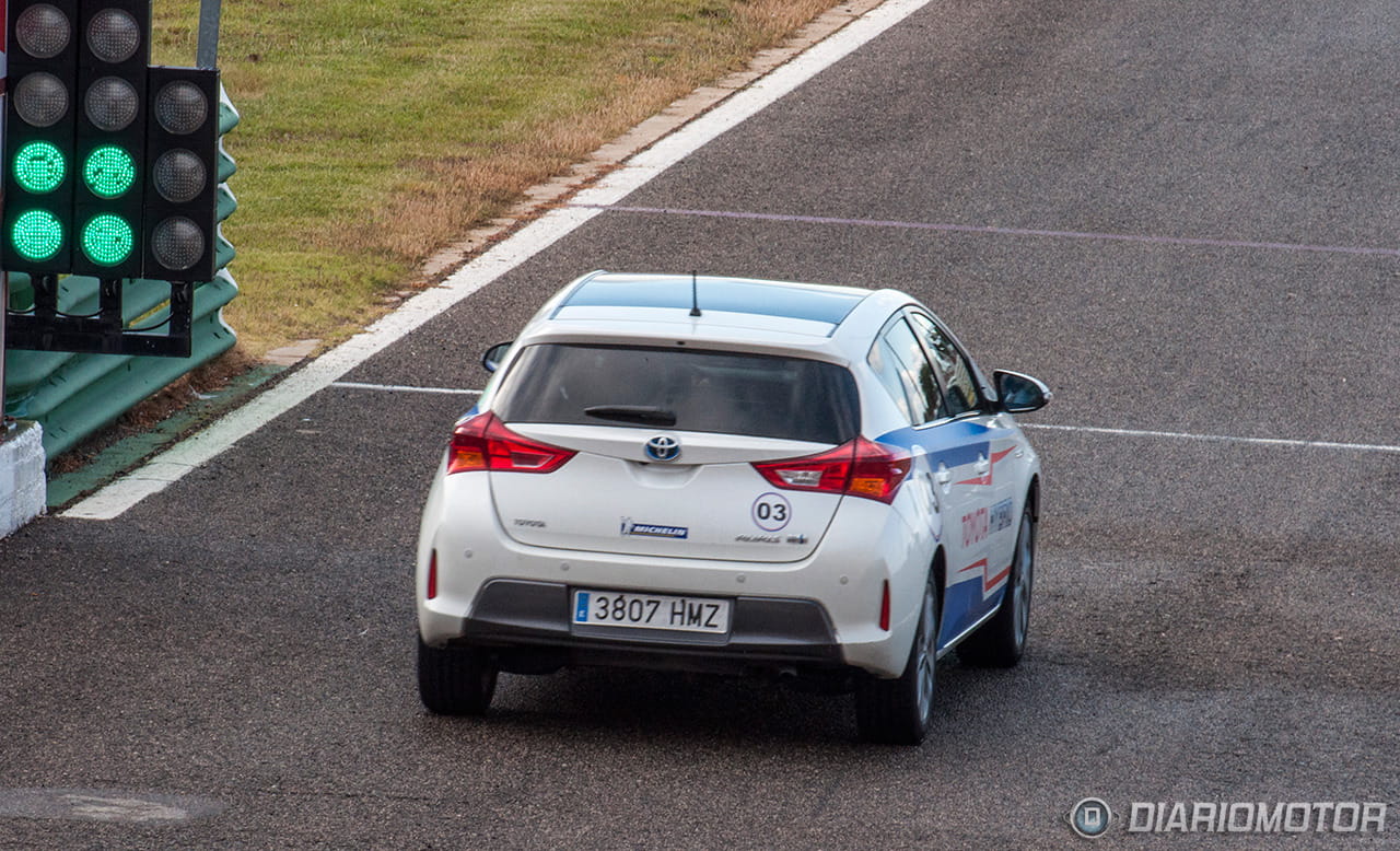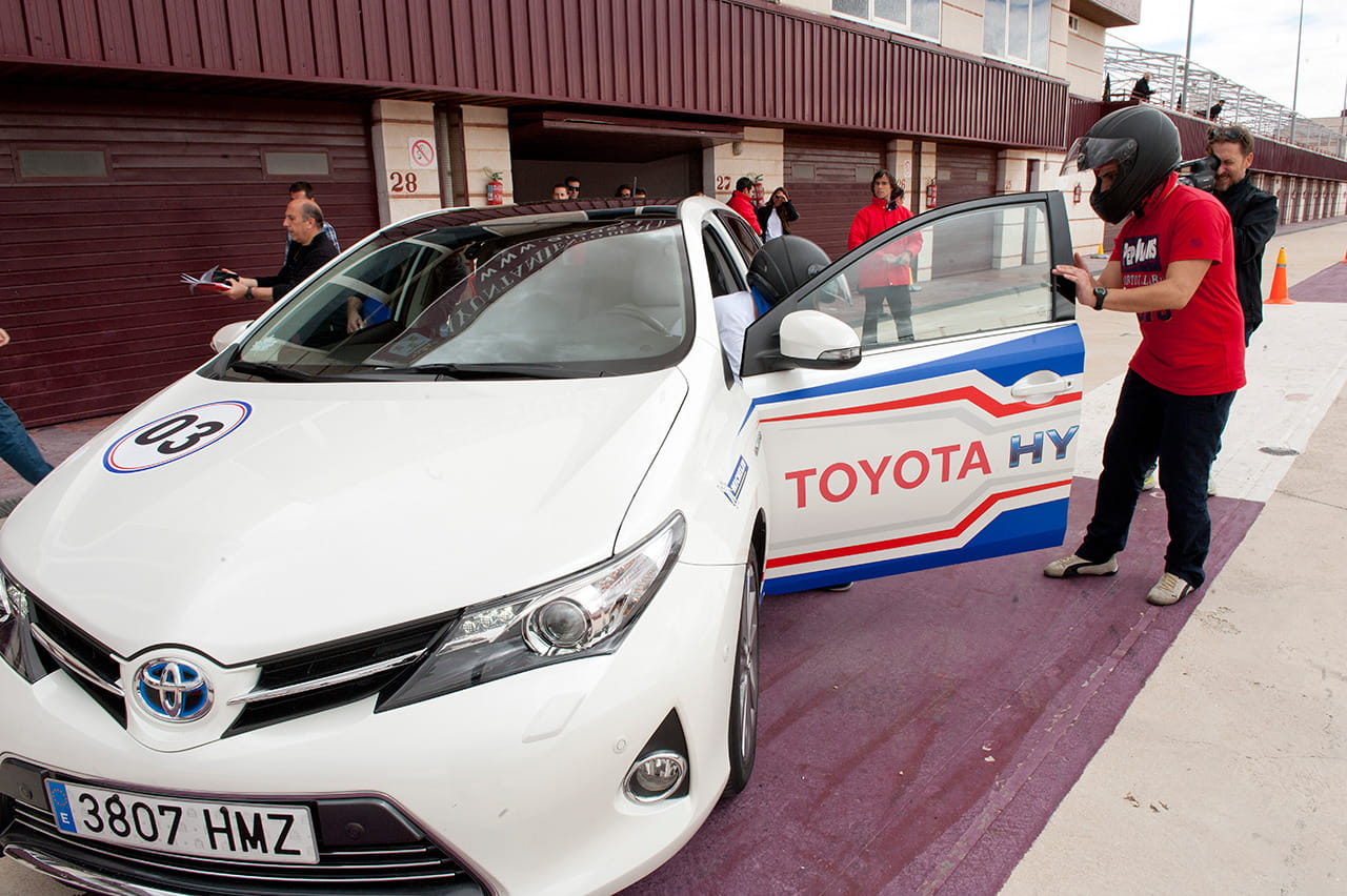 Toyota escogió uno de sus últimos lanzamientos híbridos para esta causa, el nuevo Toyota Auris Hybrid. Nos llenaron el depósito y nos dieron cuatro garrafas con veinte litros de gasolina para distribuir como quisiéramos. Con ellos, aproximadamente 125 litros en total, tendríamos que rodar durante 24 horas en circuito y, no solo eso, ser los más rápidos, los que más vueltas recorriéramos en ese tiempo, para ganar.