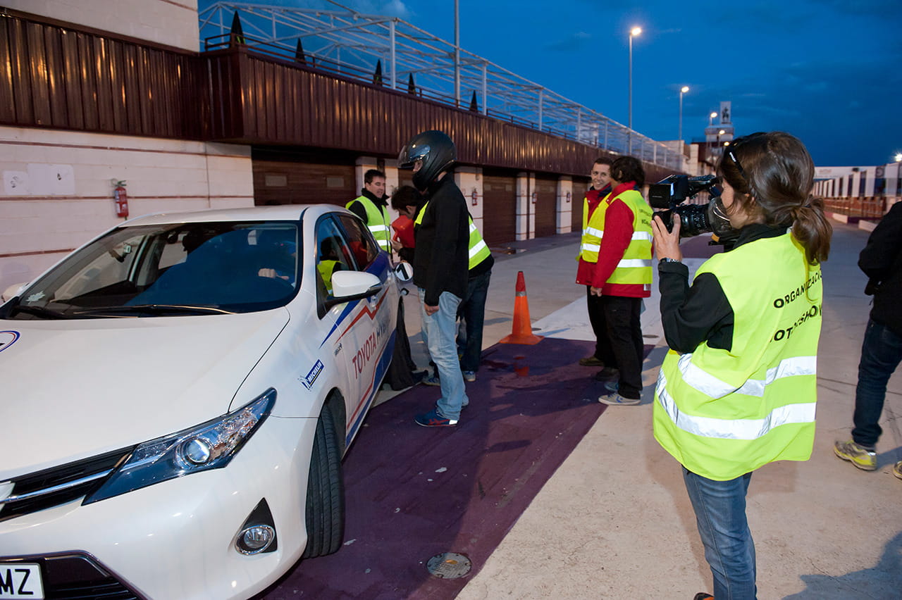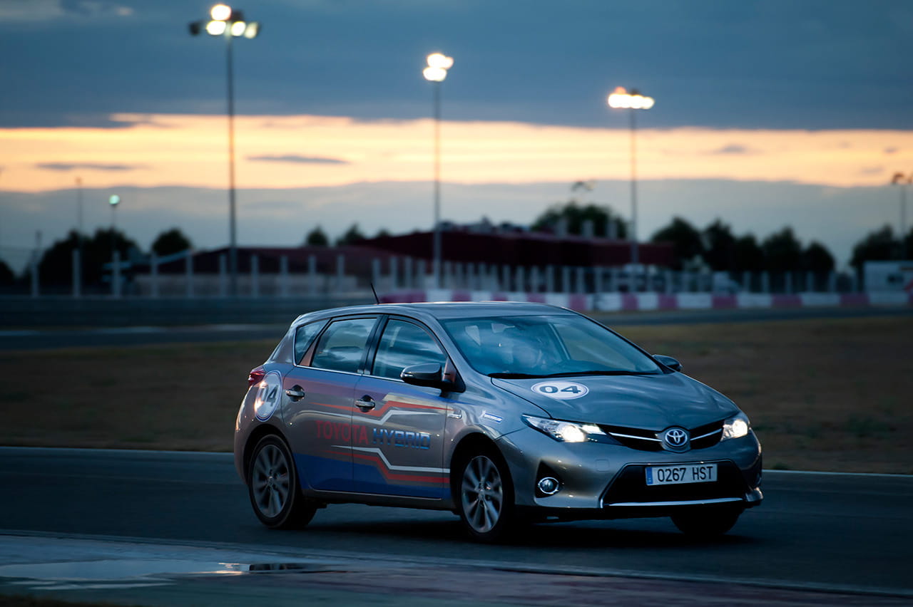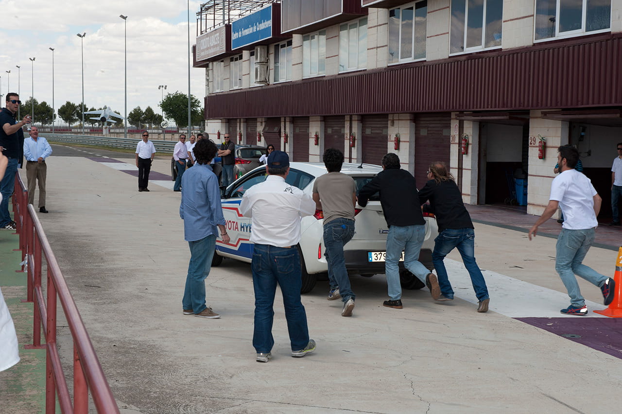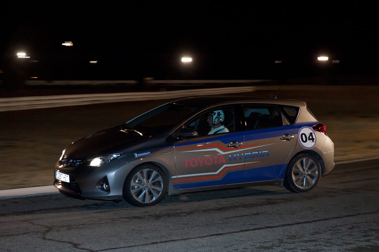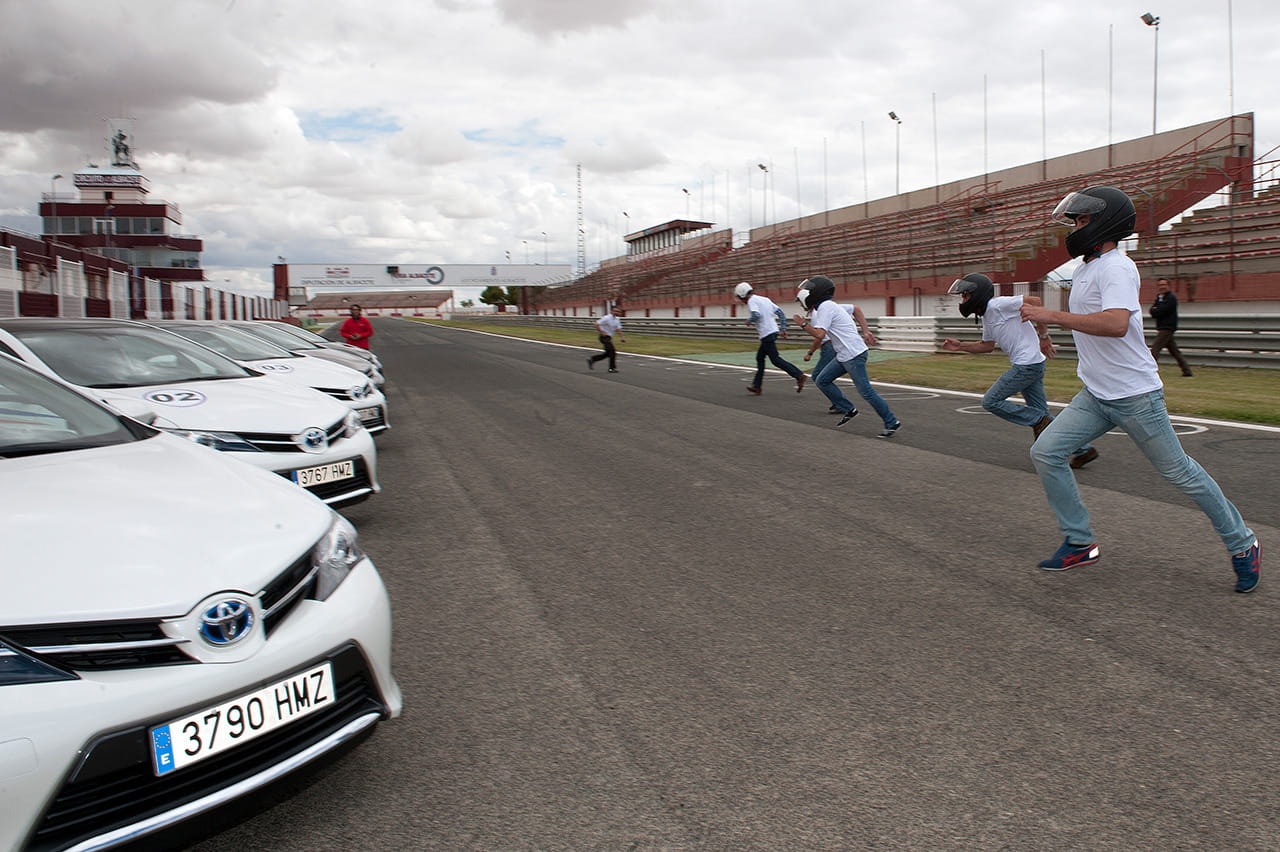Toyota escogió uno de sus últimos lanzamientos híbridos para esta causa, el nuevo Toyota Auris Hybrid. Nos llenaron el depósito y nos dieron cuatro garrafas con veinte litros de gasolina para distribuir como quisiéramos. Con ellos, aproximadamente 125 litros en total, tendríamos que rodar durante 24 horas en circuito y, no solo eso, ser los más rápidos, los que más vueltas recorriéramos en ese tiempo, para ganar.