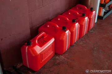 Estos cinco bidones de 20 litros contenían el combustible que podía repostar cada equipo al entrar a boxes. El máximo de repostajes de la prueba era de cuatro.