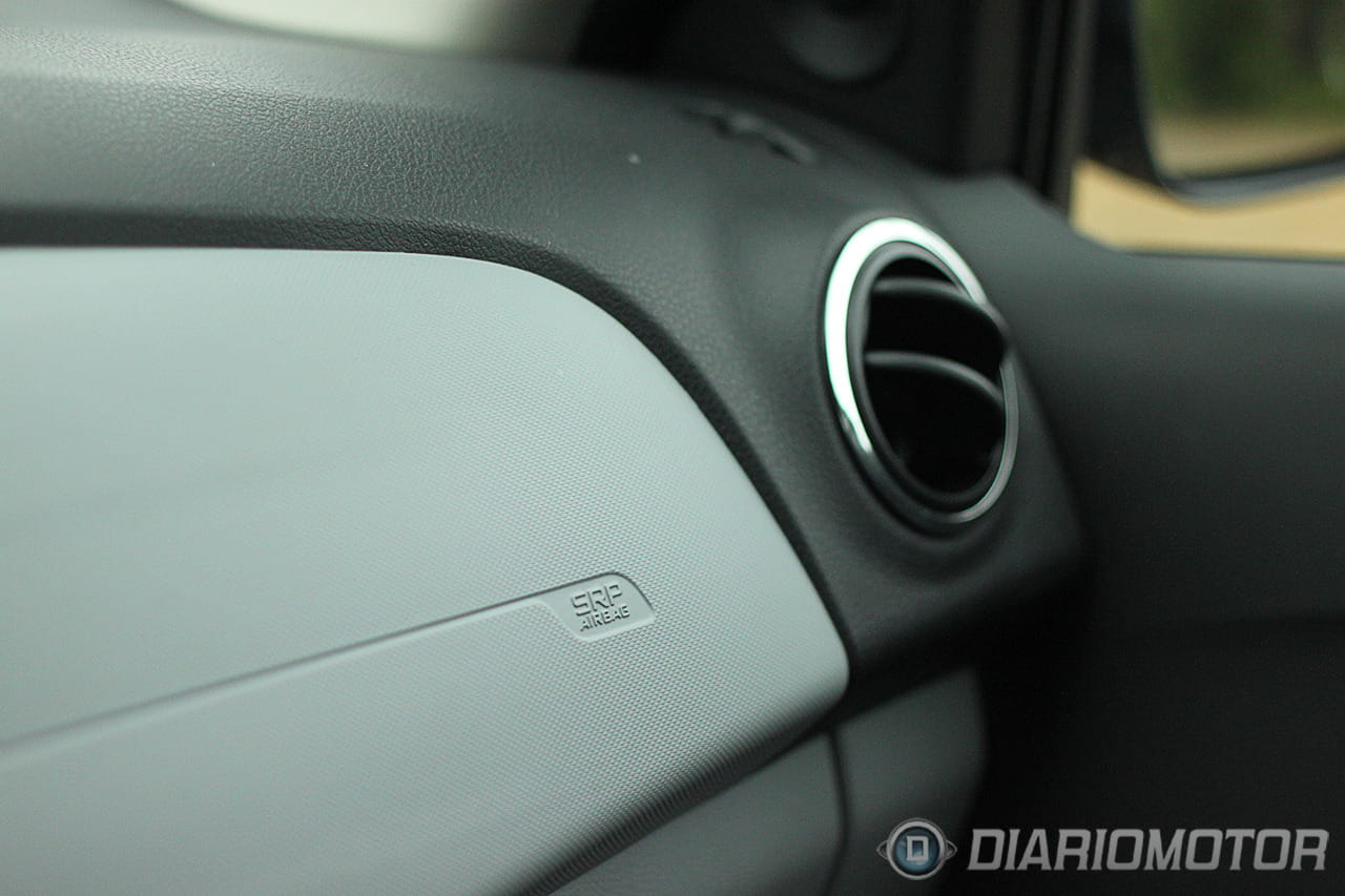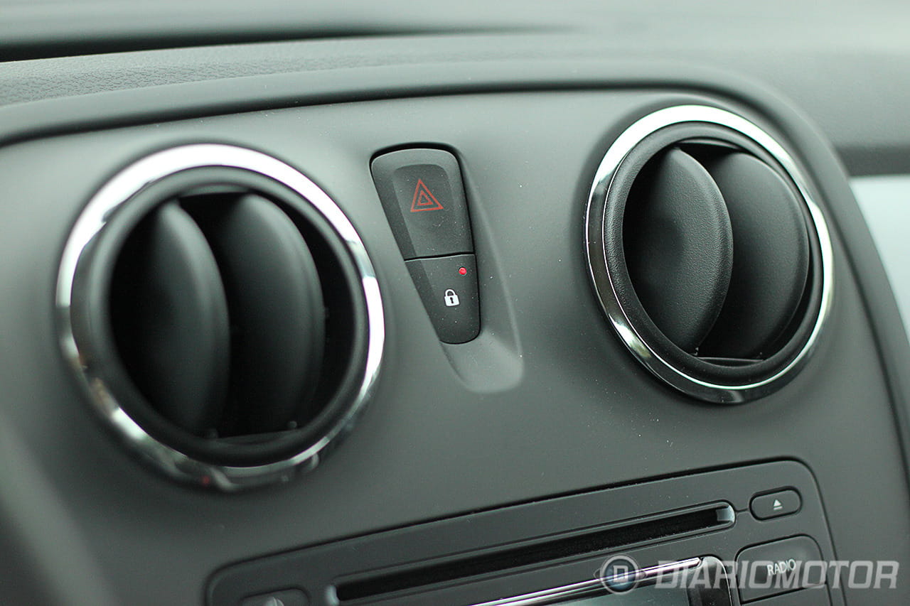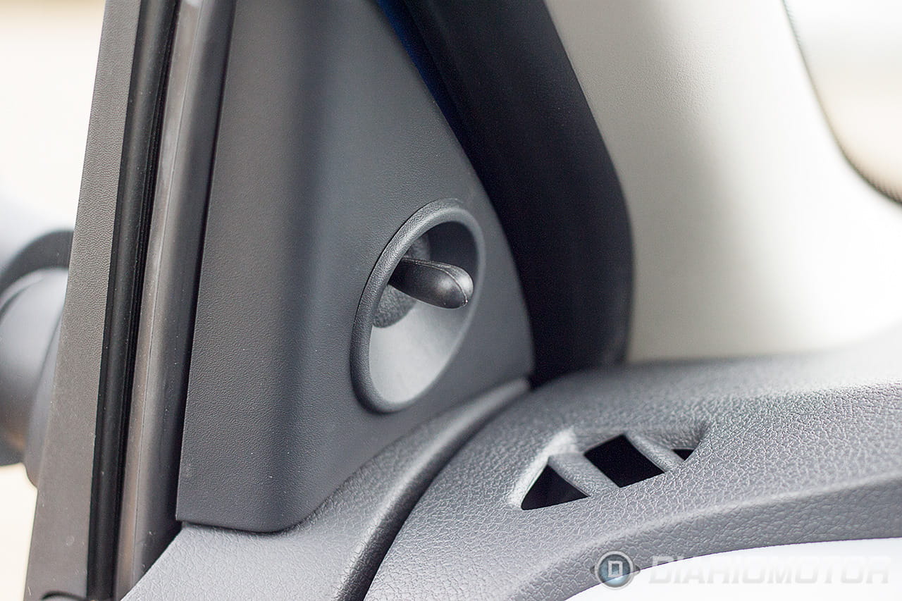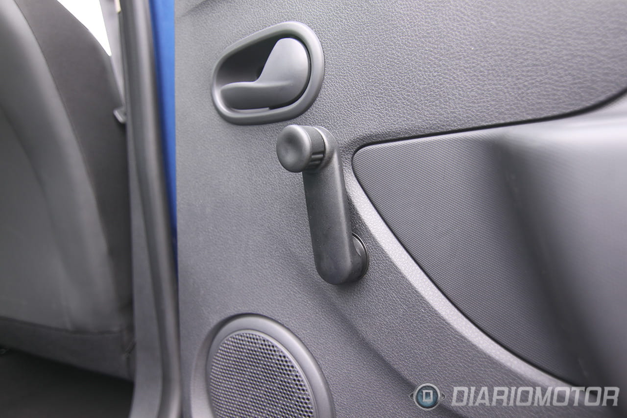 El mando que acciona la recirculación interior de aire en lugar de la entrada desde el exterior es una palanca mecánica con la que físicamente estamos moviendo alguna compuerta detrás del salpicadero. Las ventanillas traseras son de manivela y el aire acondicionado es un botón (ni rastro de climatizador) pero contamos con cierre centralizado con mando, toma USB en el equipo de sonido, Bluetooth integrado y la sorprendente presencia de un amortiguador de gas para abrir el capó, todo un lujo en la categoría.