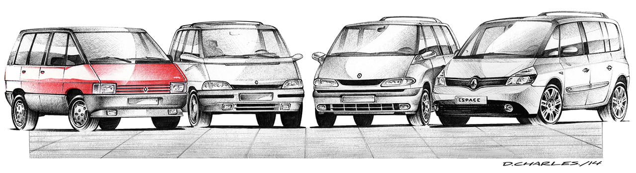 El primer Espace no dejó de evolucionar. Inicialmente lanzado con un motor de 1.995 cm3 de carburación, no tardó en recibir un diésel y cuatro años después un lavado de cara, el Phase 2, con nuevos motores y la versión Quadra, de tracción total. Antes de que cesase su comercialización en 1991, el primer Espace aún se permitió ciertos lujos, como versiones con tapizados de piel y suspensiones neumáticas.