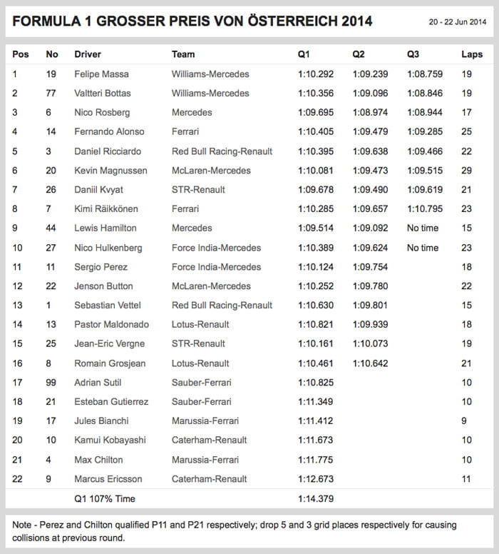 El piloto brasileño de Williams consigue así su primera pole con los colores de la de Grove y firma su reencuentro con una de sus más distintivas características: la velocidad a una vuelta. Tras él, Valtteri Bottas y un felicísimo Nico Rosberg que tiene hoy sobre el Red Bull Ring, a su principal rival para el campeonato (Lewis Hamilton) a varios puestos de distancia. Fernando Alonso conseguiría el cuarto mejor crono y Daniel Ricciardo el quinto. Inmediatamente después aparecía Kevin Magnussen a tan solo unas centésimas del australiano de Red Bull, seguido por un sorprendente y rapidísimo Daniil Kvyat y por Kimi Raikkonen. Cerrando el grupo calificador en Q3, el británico de Mercedes AMG y Nico Hulkenberg, ambos sin marcar tiempo.