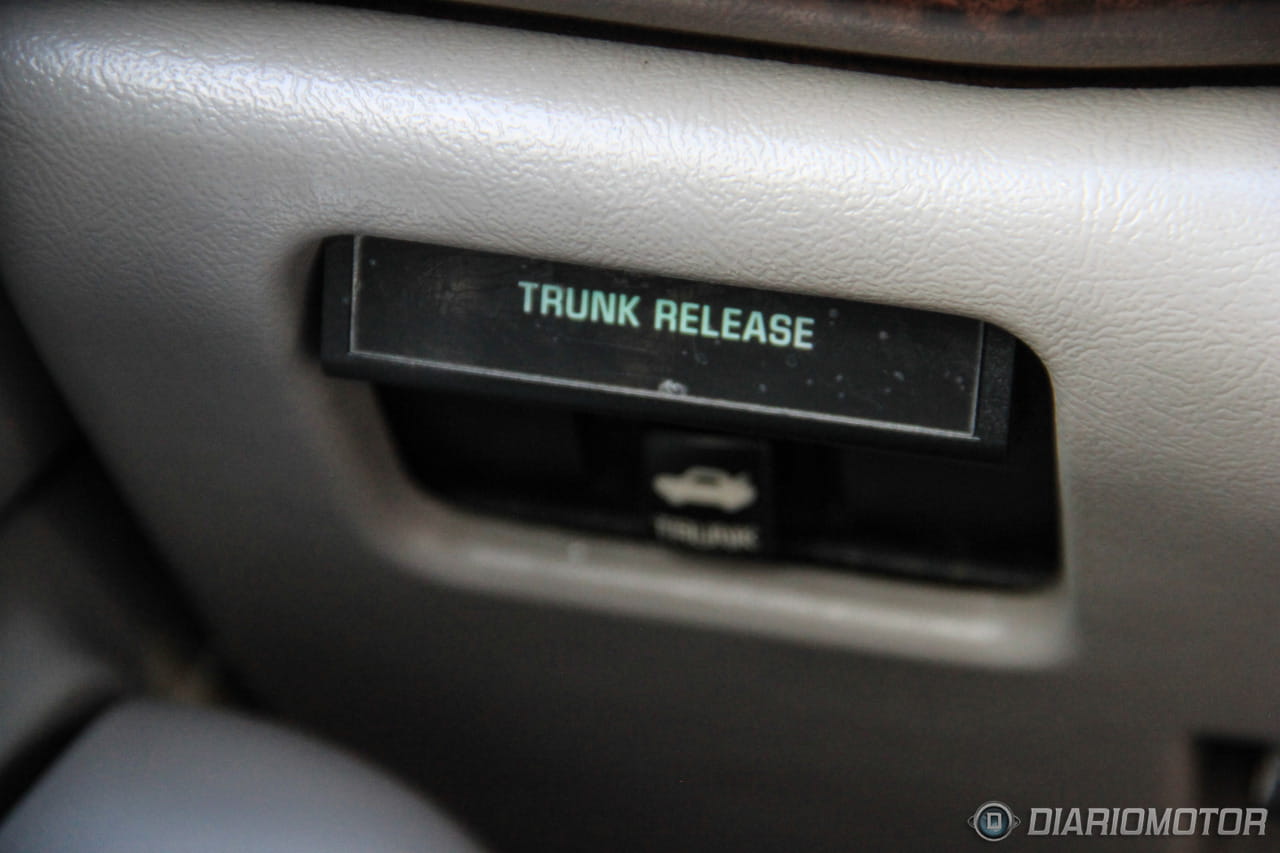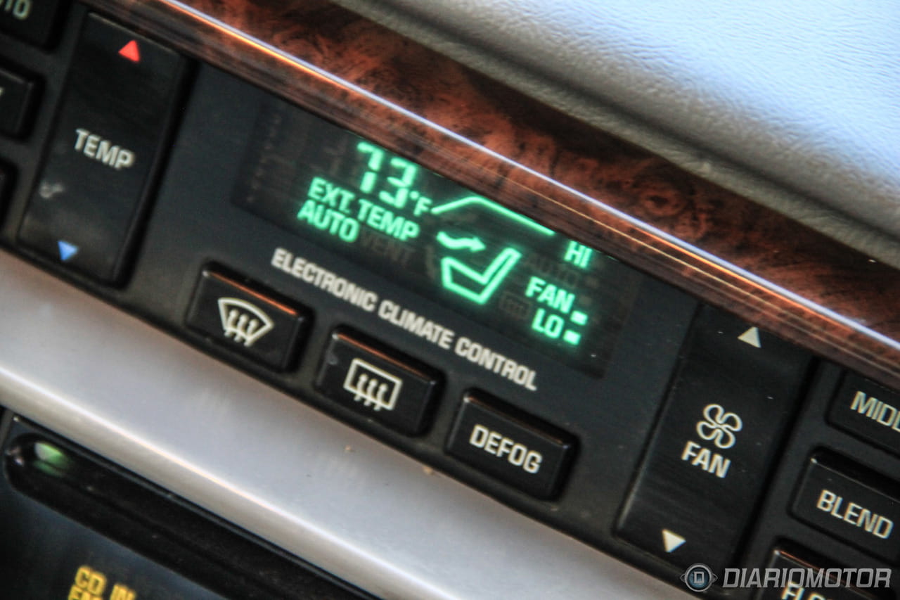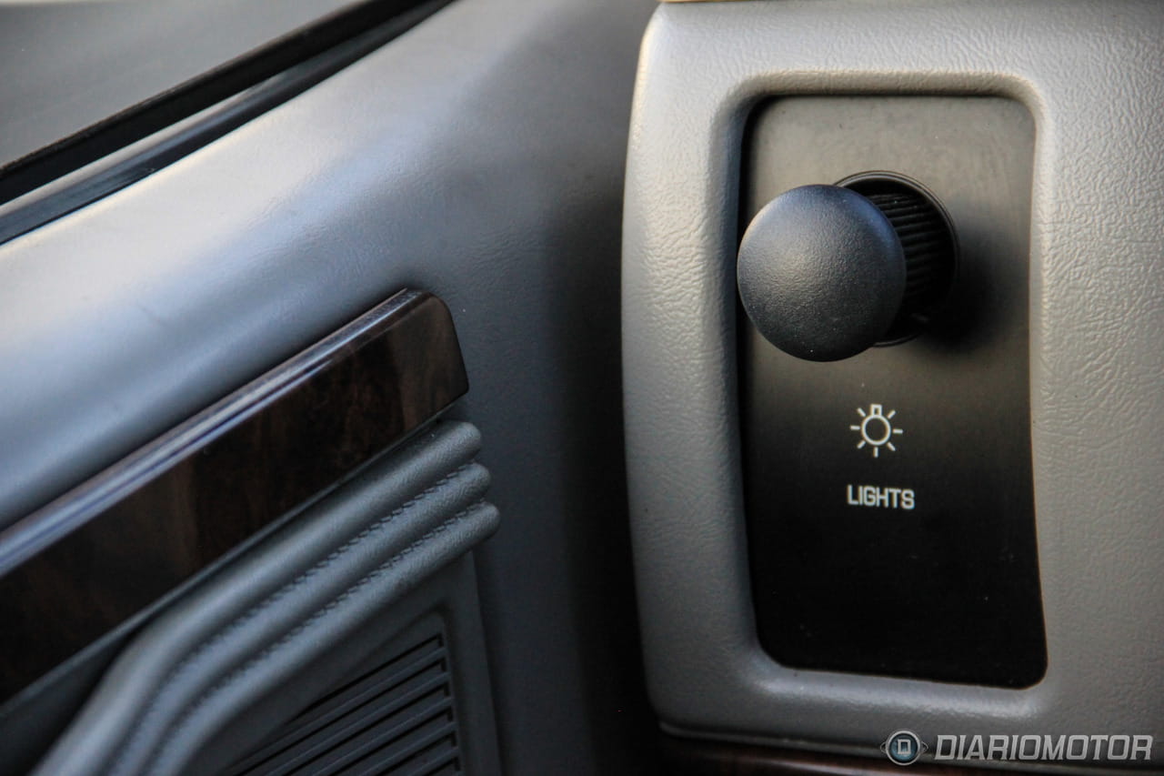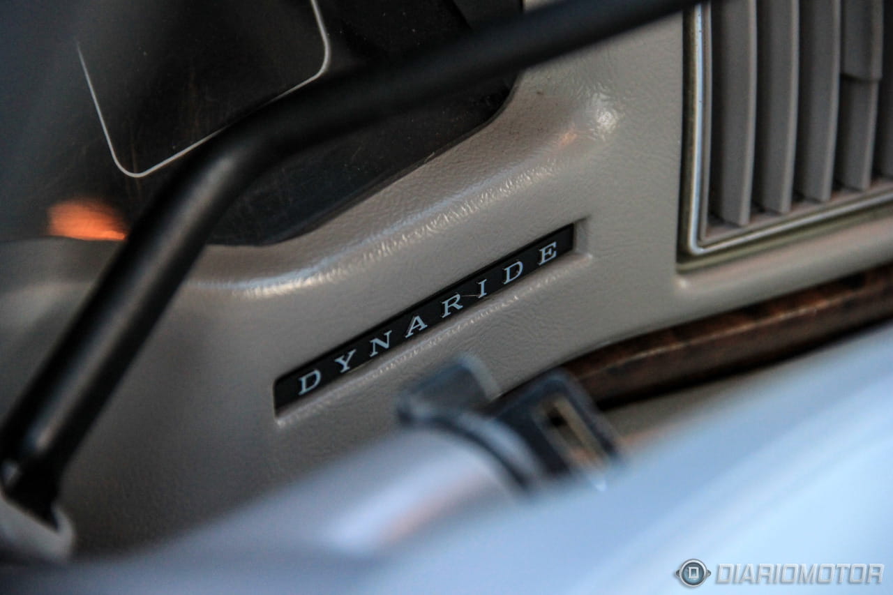 La instrumentación sólo cuenta con un velocímetro, temperatura del agua y cantidad de combustible. No hay ninguna complicación electrónica a la vista, y sólo un botón para encender y apagar las luces. Sin embargo, en la puerta tengo todo tipo de reglajes eléctricos para el asiento del conductor. Las únicas botoneras que hay en la consola central son un sencillo – pero potente – equipo de audio y los controles del climatizador. El volante es sólo regulable en altura. Un emblema reza Roadmaster y otro Dynaride, refiriéndose a la suspensión del coche.