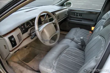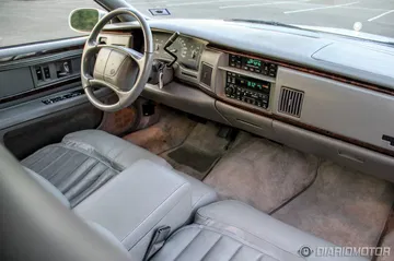 Cuero de color gris claro y madera falsa adorna el habitáculo hasta donde la vista alcanza. La amplitud es algo que se da por hecho en el Roadmaster. Seis personas viajan muy cómodamente, sin constricción alguna. No hay más que ver que los asientos son literalmente butacones, en los que nuestro cuerpo se hunde sin remisión. El salpicadero no tiene consola central, y en la columna de la dirección se monta la palanca de la caja de cambios automática de cuatro relaciones. Es realmente un viaje en el tiempo trasladarse a este vehículo.