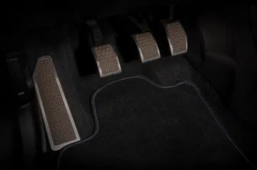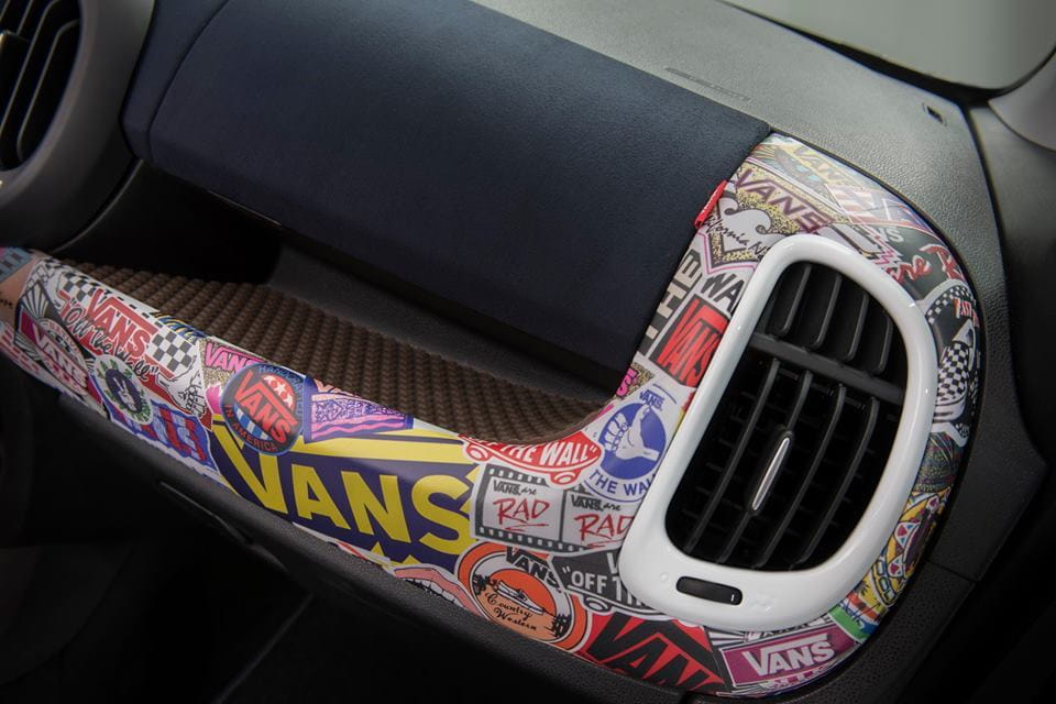 A bordo, el salpicadero se ha decorado con temática de adhesivos Vans y tapizados de palmeras en combinación con detalles en piel blanca.
