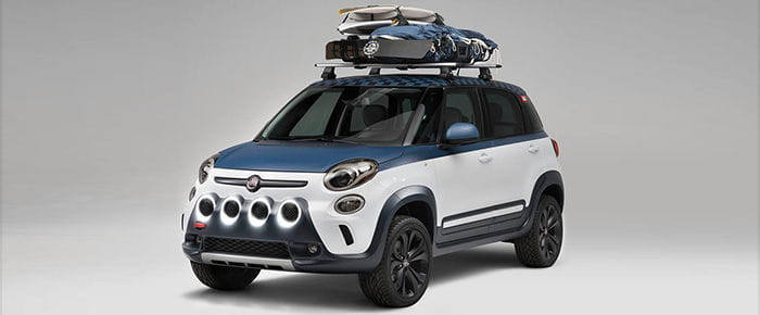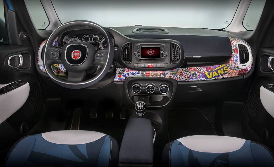 El Fiat 500L Vans Concept centra la atención por todo lo que concierne a su personalización estética. Fijaos en su techo de bandera a cuadros, los detalles en negro mate y brillante, sus llantas de 18” negras y sus suspensiones elevadas, los detalles de las defensas y la cubierta estilo Fiat Panda Cross de la parrilla frontal.