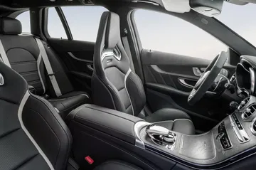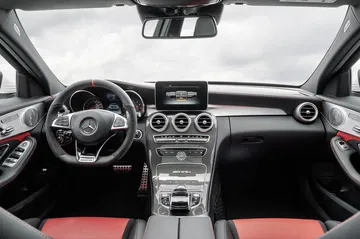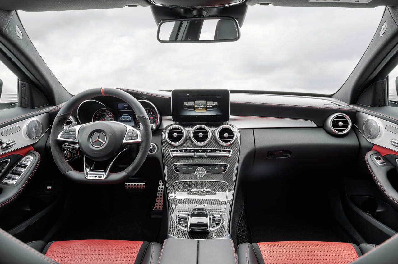 La distinción y la deportividad exterior también se ha trasladado al habitáculo del Mercedes C-63 AMG, con un contraste muy marcado en el uso de materiales más nobles, como los tapizados de piel o los revestimientos de aluminio cepillado y más racing, como la fibra de carbono, la sección de Alcantara del volante, la piel microperforada de la base y el respaldo de los asientos y las costuras visibles en rojo. El cliente también tendrá la posibilidad de quedarse con los asientos deportivos de serie, u optar por unos aún más radicales, los asientos Performance.