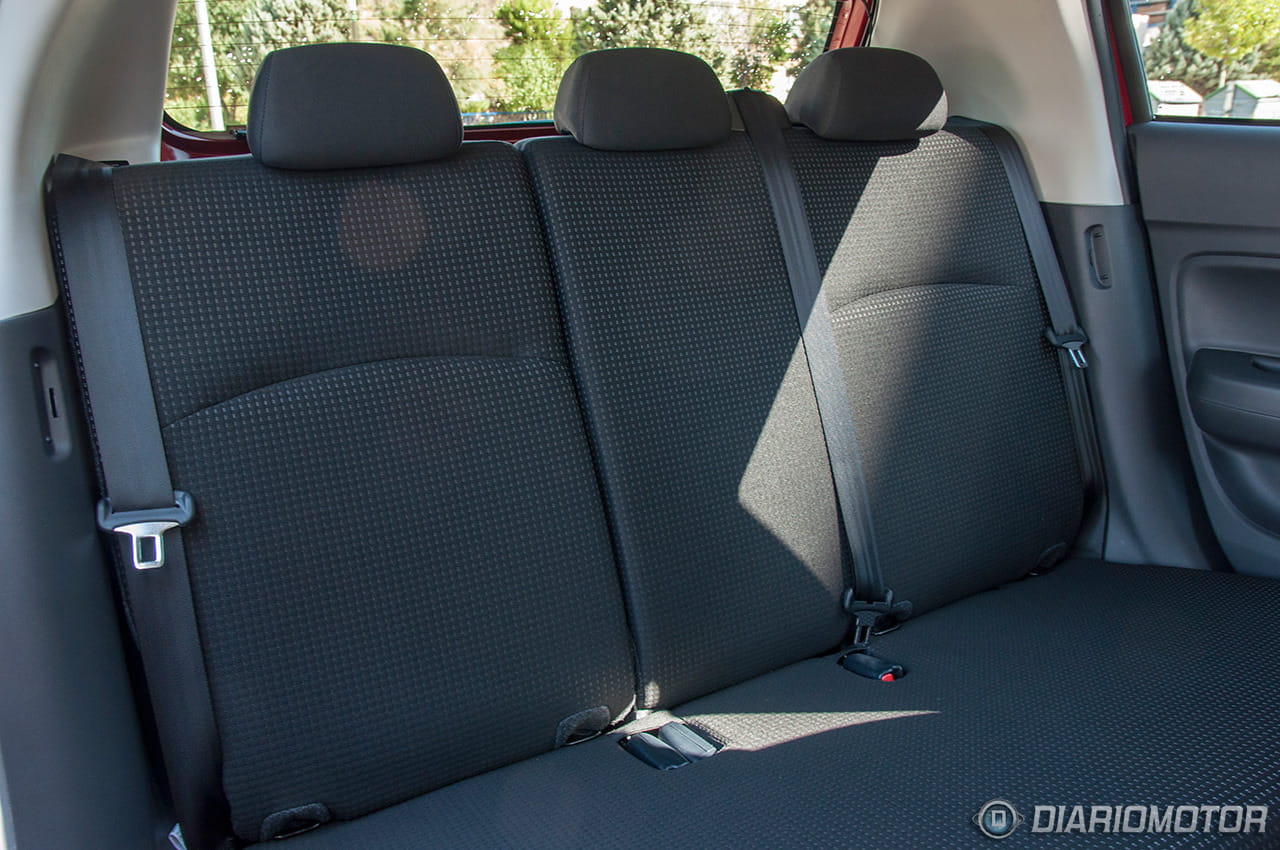 Este Space Star no deja de darnos sorpresas, y en la mayoría de los casos gratas sorpresas. Antes de probarlo nos decían que el Mitsubishi Space Star goza con tres plazas traseras reales. Hay que tener en cuenta que en esta categoría es habitual que la banqueta trasera solo cuente con dos plazas. Este coche está homologado para tres pasajeros y, bien es cierto que no va a gozar de una banqueta lo suficientemente ancha como para viajes largos, pero sus tres reposacabezas y una banqueta corrida, completamente lisa, permiten que el pasajero del centro viaje relativamente cómodo y seguro, al menos en trayectos cortos, urbanos. Además, el espacio para las piernas es realmente holgado, no mucho más limitado que el que ofrecen modelos de una categoría superior.