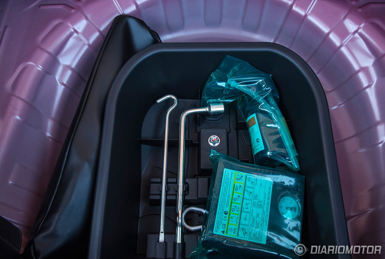 Para alcanzar esas cifras de carga, el Mitsubishi Space Star ha tenido que renunciar a rueda de repuesto temporal. Bajo el suelo del maletero se encuentra un kit de reparación de pinchazos.