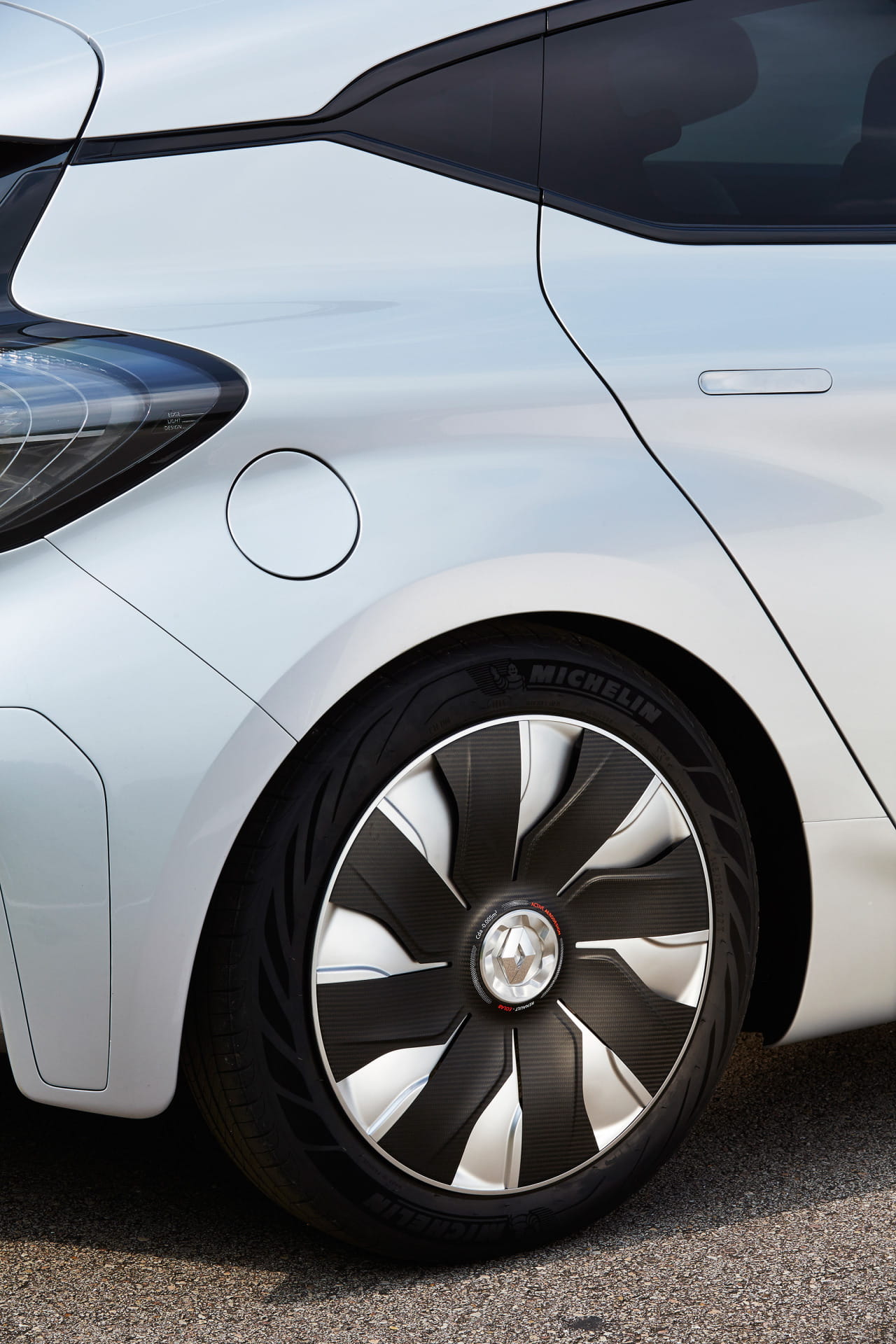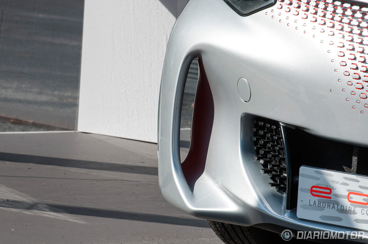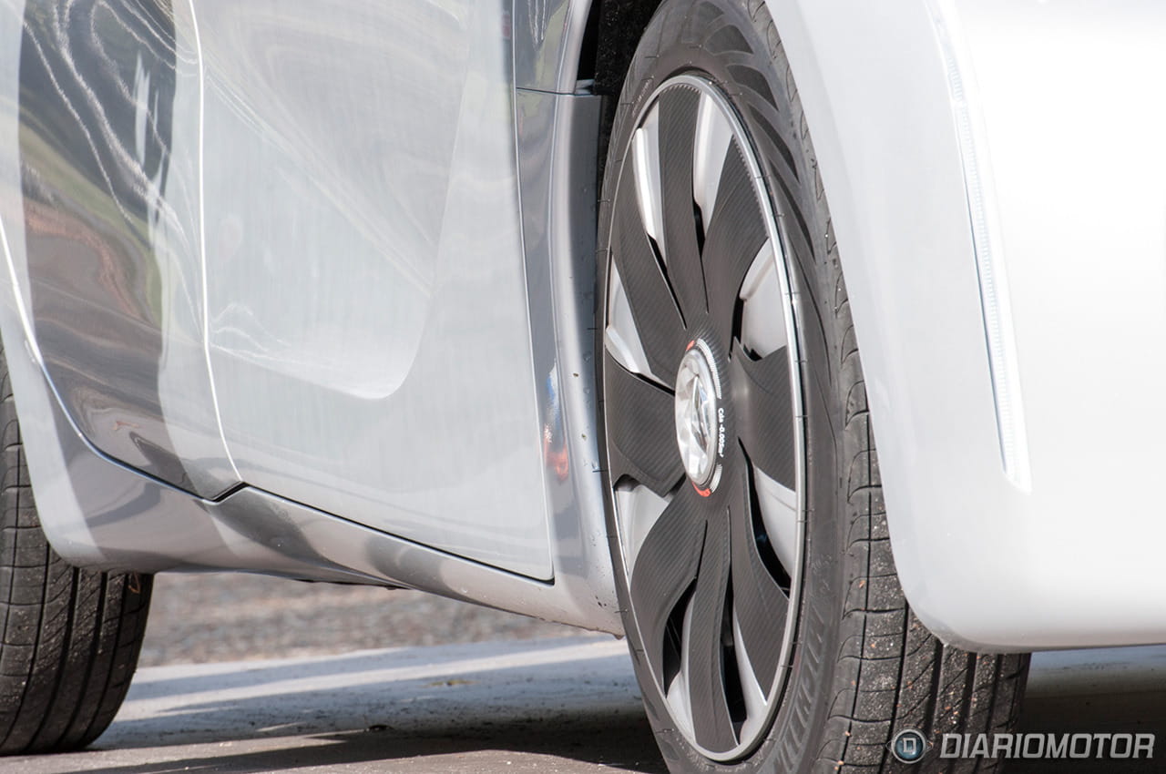 El Renault Eolab que pudimos conducir es único en su especie, no hay más en todo el mundo. Si bien es cierto que Renault creó dos prototipos claramente diferenciados, un Eolab plenamente funcional, el que durante estos días ha estado a disposición de la prensa y más tarde seguirá al servicio de los equipos de desarrollo de la marca, y un Eolab conceptual, un ejercicio de diseño artesano que aún se exhibe en el Salón de París. El modelo que probamos nosotros mantiene la estética del modelo conceptual, su peculiar diseño de tres puertas y algunos detalles, no todos, del habitáculo. Por ejemplo, este prototipo funcional no prescinde del pilar central en el lado derecho, reforzado con una columna moldeada con un polímero de fibra de carbono.
