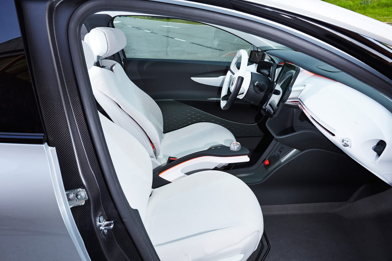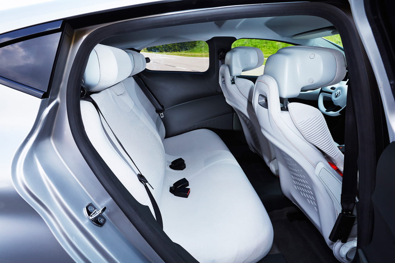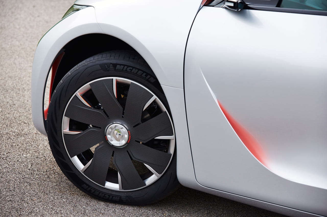 El Renault Eolab que pudimos conducir es único en su especie, no hay más en todo el mundo. Si bien es cierto que Renault creó dos prototipos claramente diferenciados, un Eolab plenamente funcional, el que durante estos días ha estado a disposición de la prensa y más tarde seguirá al servicio de los equipos de desarrollo de la marca, y un Eolab conceptual, un ejercicio de diseño artesano que aún se exhibe en el Salón de París. El modelo que probamos nosotros mantiene la estética del modelo conceptual, su peculiar diseño de tres puertas y algunos detalles, no todos, del habitáculo. Por ejemplo, este prototipo funcional no prescinde del pilar central en el lado derecho, reforzado con una columna moldeada con un polímero de fibra de carbono.