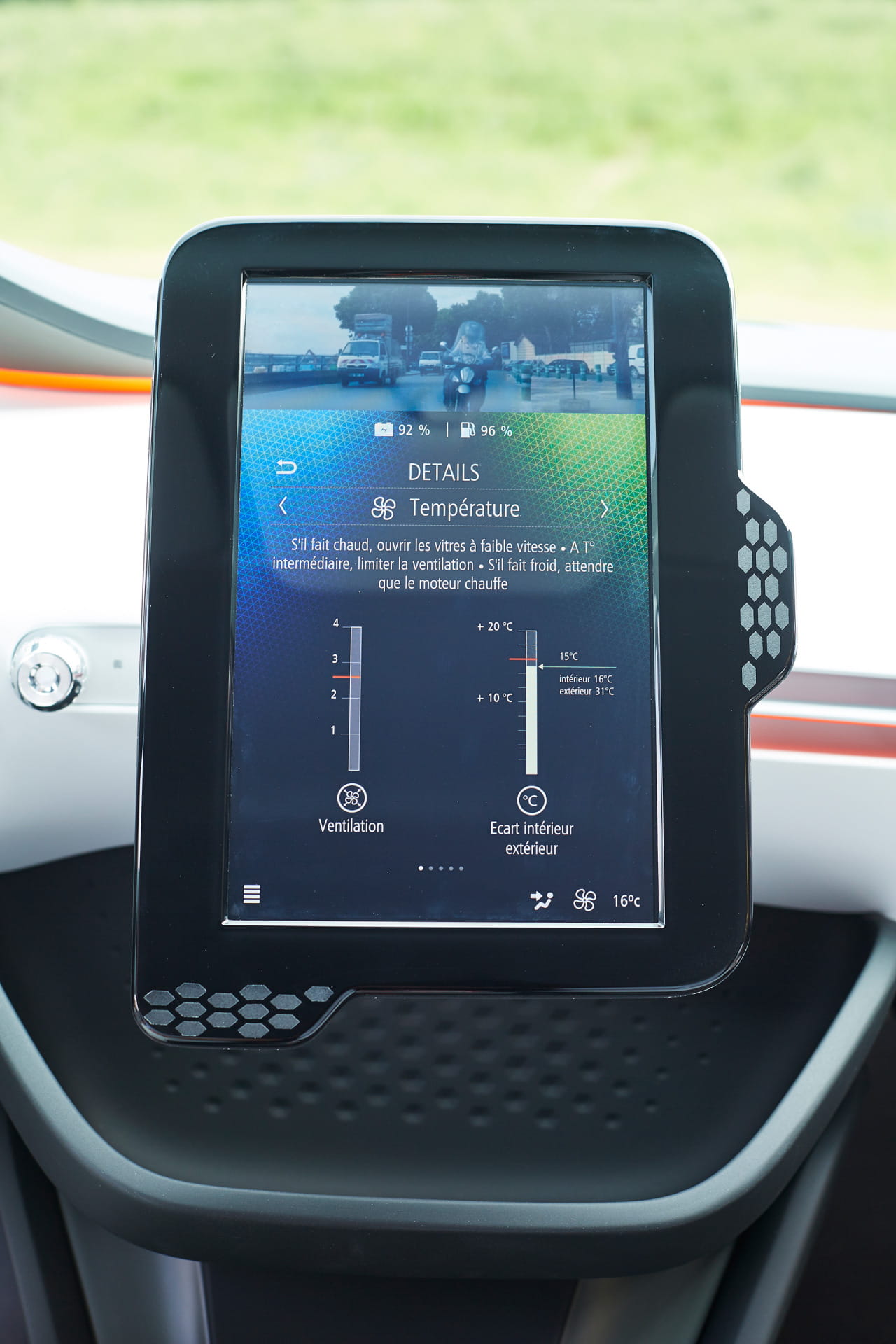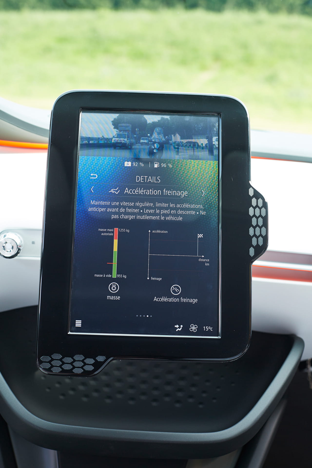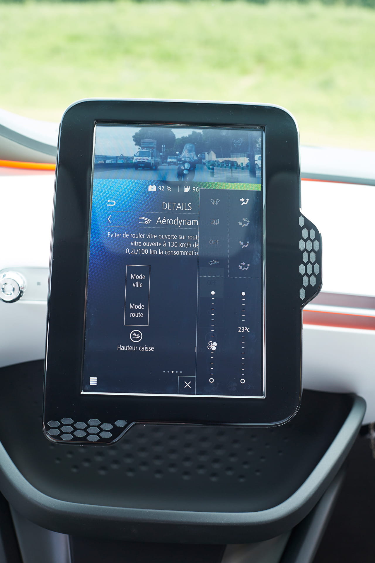 La importancia de la optimización energética ha llevado a Renault a diseñar un equipo central de información y entretenimiento que intentará transmitirnos toda la información posible sobre lo que está sucediendo en nuestro coche. La visión más gráfica de los factores que influyen en el consumo energético nos la mostrará un pentagrama con cinco vértices: temperatura, neumáticos, aerodinámica, aceleración y frenado y pendientes del terreno. Los sensores distribuidos por el habitáculo harán que las aristas crezcan hacia el vértice aerodinámico, por ejemplo, si abrimos una ventanilla en la autopista, recordándonos que esa acción, aparentemente inocua, está penalizando el trabajo aerodinámico de este flamante prototipo.