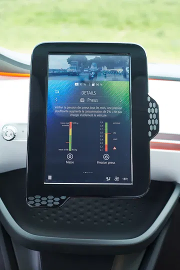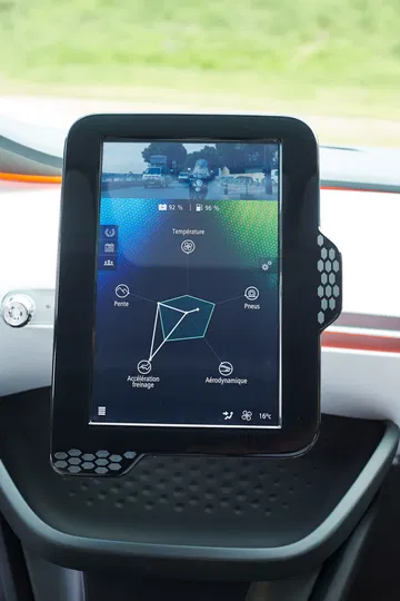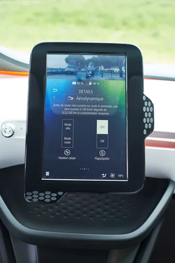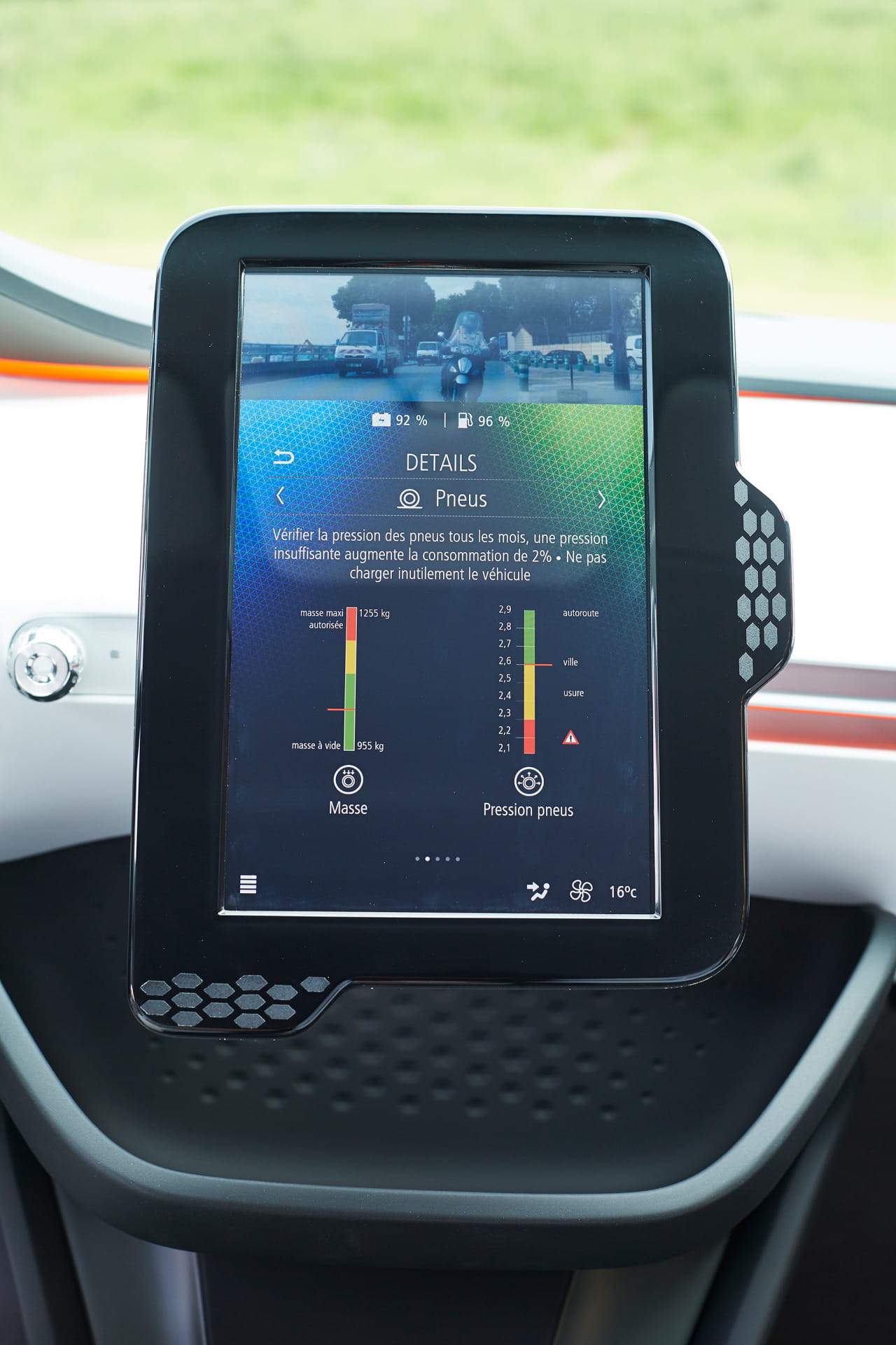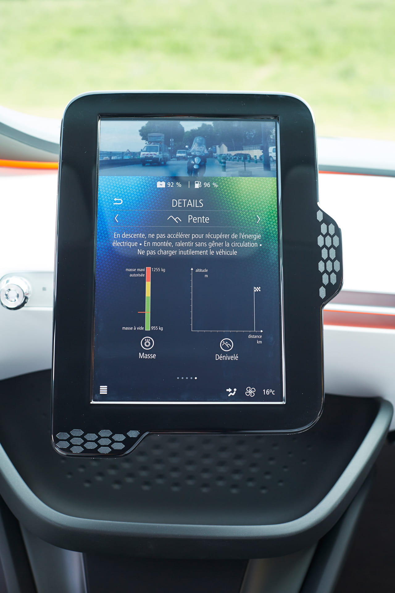 La importancia de la optimización energética ha llevado a Renault a diseñar un equipo central de información y entretenimiento que intentará transmitirnos toda la información posible sobre lo que está sucediendo en nuestro coche. La visión más gráfica de los factores que influyen en el consumo energético nos la mostrará un pentagrama con cinco vértices: temperatura, neumáticos, aerodinámica, aceleración y frenado y pendientes del terreno. Los sensores distribuidos por el habitáculo harán que las aristas crezcan hacia el vértice aerodinámico, por ejemplo, si abrimos una ventanilla en la autopista, recordándonos que esa acción, aparentemente inocua, está penalizando el trabajo aerodinámico de este flamante prototipo.