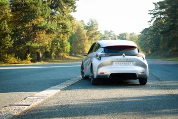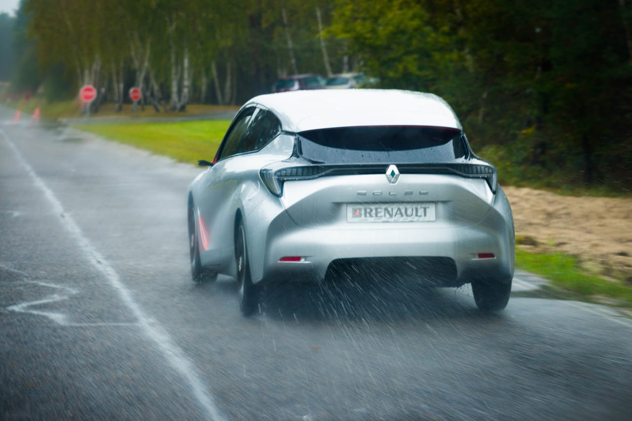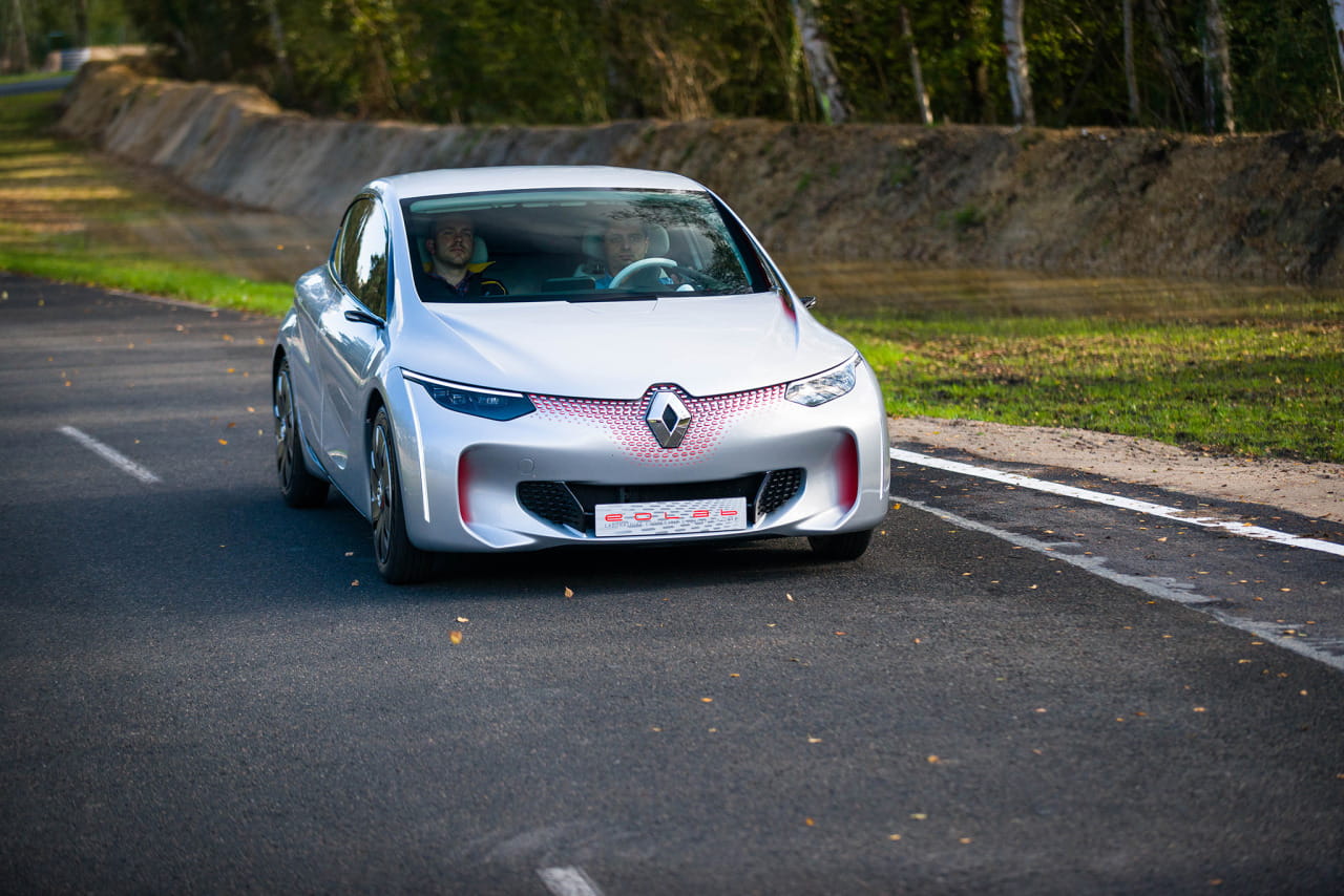 Uno de los técnicos de Renault va a acompañarme sentado a mi derecha, aunque no para abroncarme si me pesa el pie derecho. Las instrucciones han sido claras. El trazado en el que probaremos el Renault Eolab no es el de un circuito de velocidad, es estrecho, la escapatorias cortas y de barro y hierba, apenas hay pianos y el asfalto bacheado en alguna zona y deslizante por la lluvia de los últimos días y montoneras de hojas que se han precipitado sobre la pista dibujando un panorama de lo más otoñal. Los responsables de Renault nos piden precaución, aunque confían en las cualidades de su coche y en un neumático experimental de Michelin con 145 milímetros de goma sobre el asfalto, llanta de 17” y perfil 70. Una combinación que os aseguro que jamás he probado en ningún otro coche y que a priori es la ideal para lidiar con cualquier posibilidad de aquaplaning.