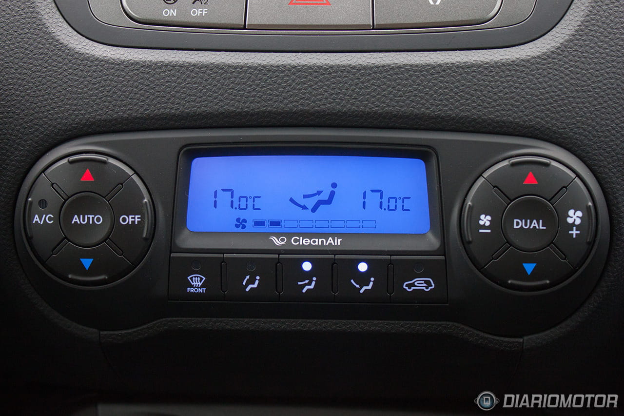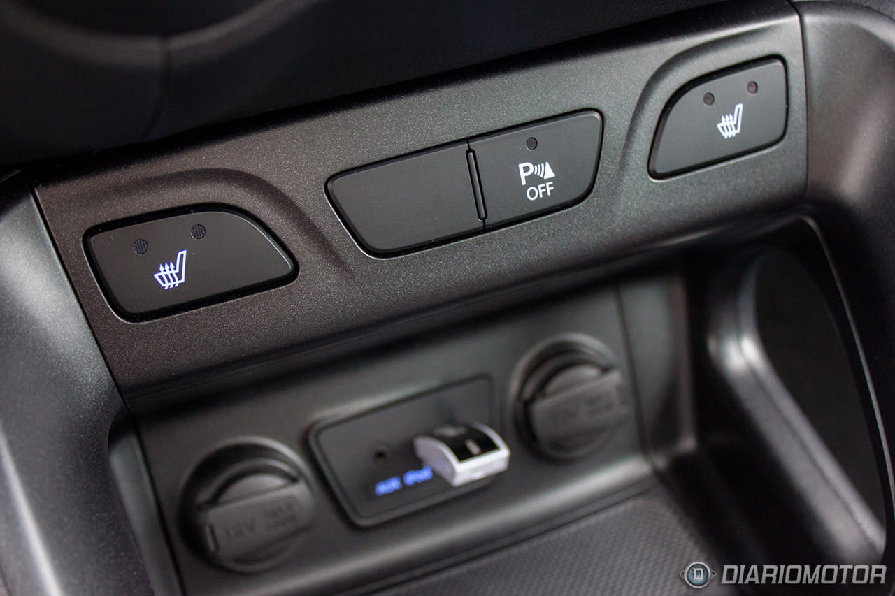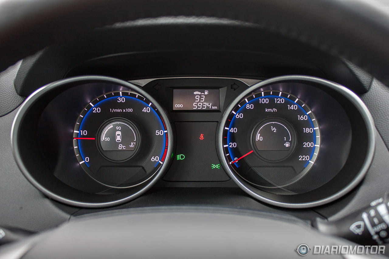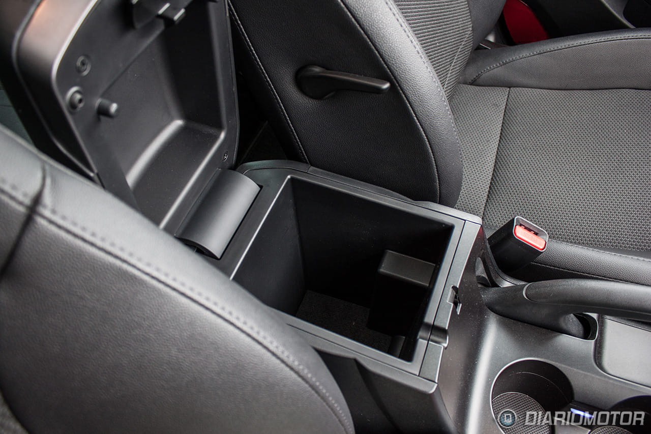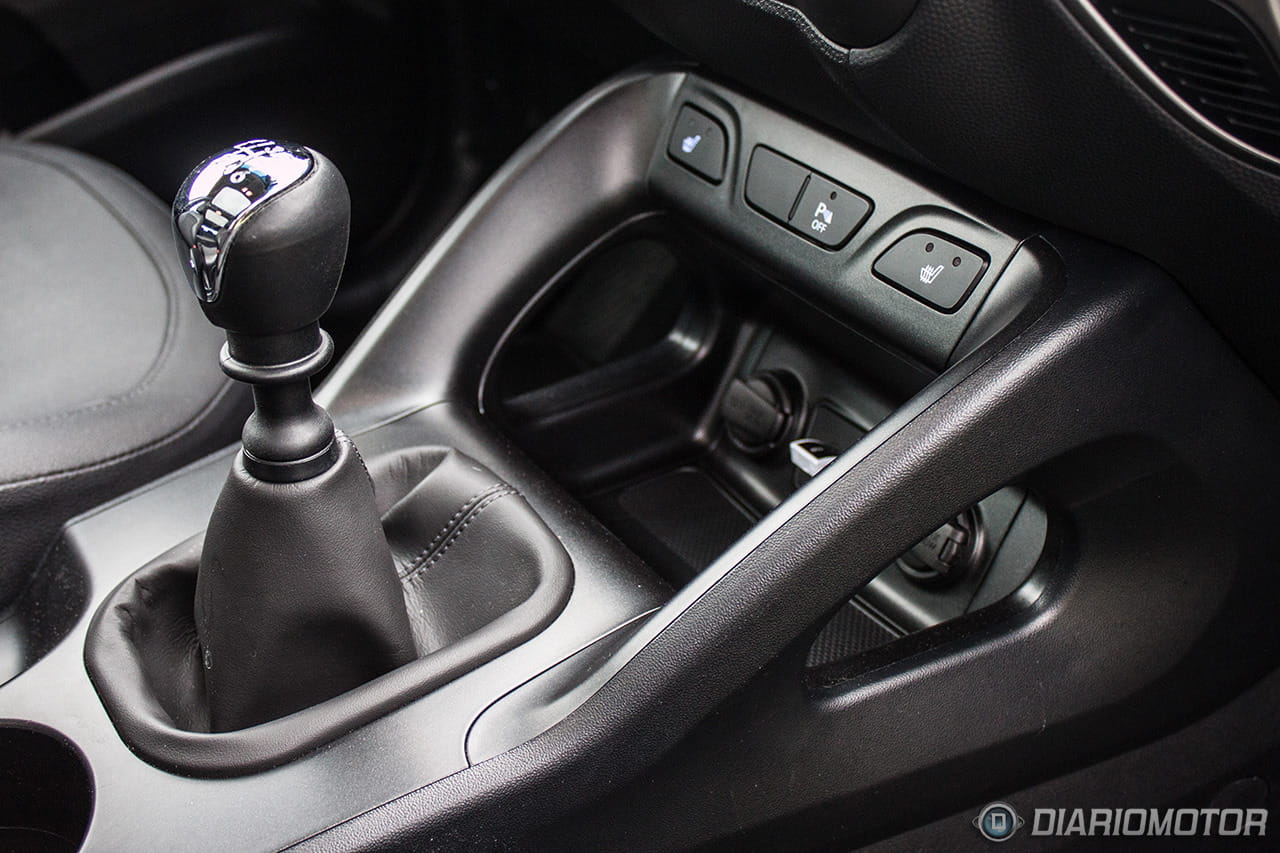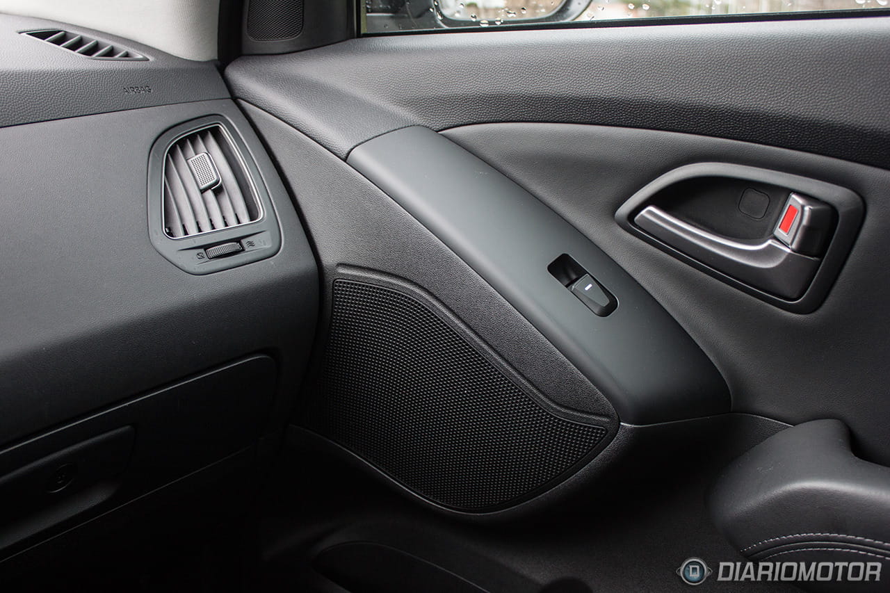 Una instrumentación de muy fácil lectura, con los justo y necesario, pero sin carencias o excesos. El ordenador de a bordo con los contadores de kilometraje podría ser más bonito, pero no hay queja alguna de su funcionalidad. El Hyundai ix35 destaca en la abundancia de huecos donde descargar nuestros bolsillos. Podríamos descargar muchas pertenencias y aún encontrar dónde situarlas: es posible incluso perderlas de tanto espacio disponible – entiéndase esto como elogio en tono jocoso. A los huecos para botellas grandes en las puertas se suma un espacio bajo la consola central considerable, forrado en goma, con tomas de corriente y la entrada auxiliar del equipo de infoentretenimiento.