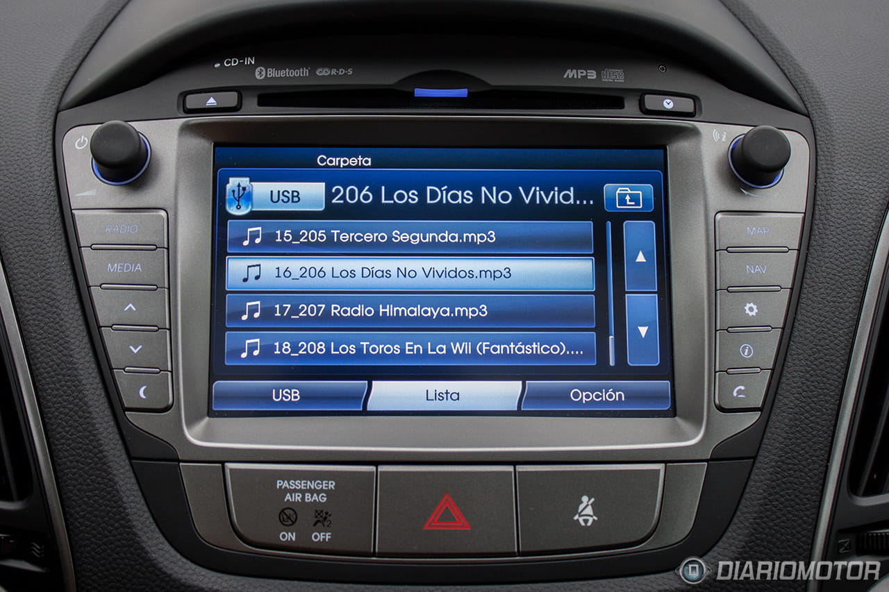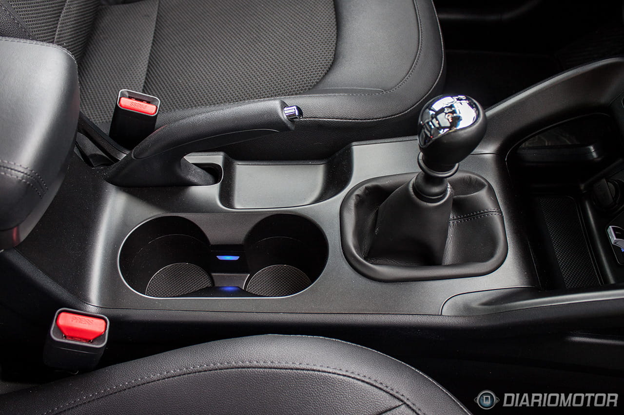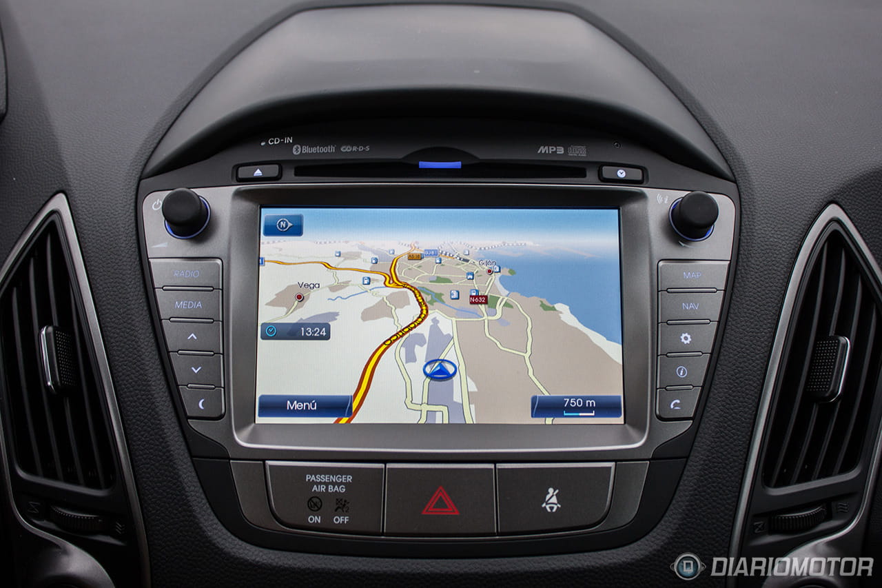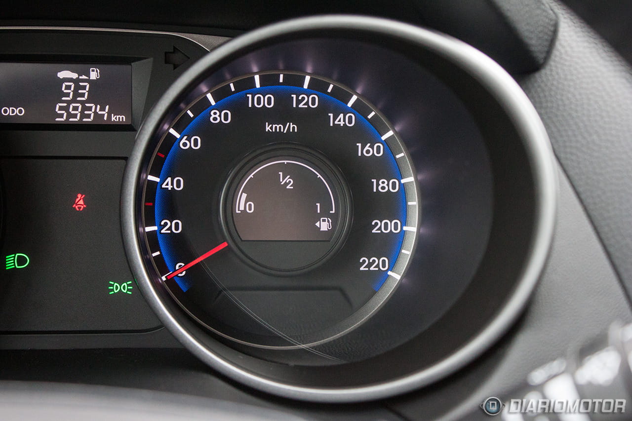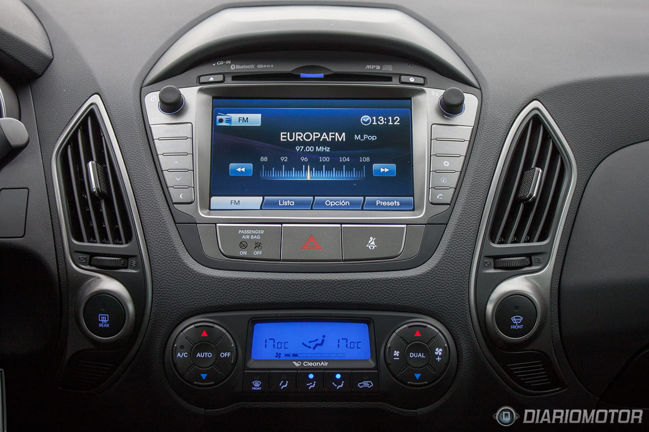 Una instrumentación de muy fácil lectura, con los justo y necesario, pero sin carencias o excesos. El ordenador de a bordo con los contadores de kilometraje podría ser más bonito, pero no hay queja alguna de su funcionalidad. El Hyundai ix35 destaca en la abundancia de huecos donde descargar nuestros bolsillos. Podríamos descargar muchas pertenencias y aún encontrar dónde situarlas: es posible incluso perderlas de tanto espacio disponible – entiéndase esto como elogio en tono jocoso. A los huecos para botellas grandes en las puertas se suma un espacio bajo la consola central considerable, forrado en goma, con tomas de corriente y la entrada auxiliar del equipo de infoentretenimiento.