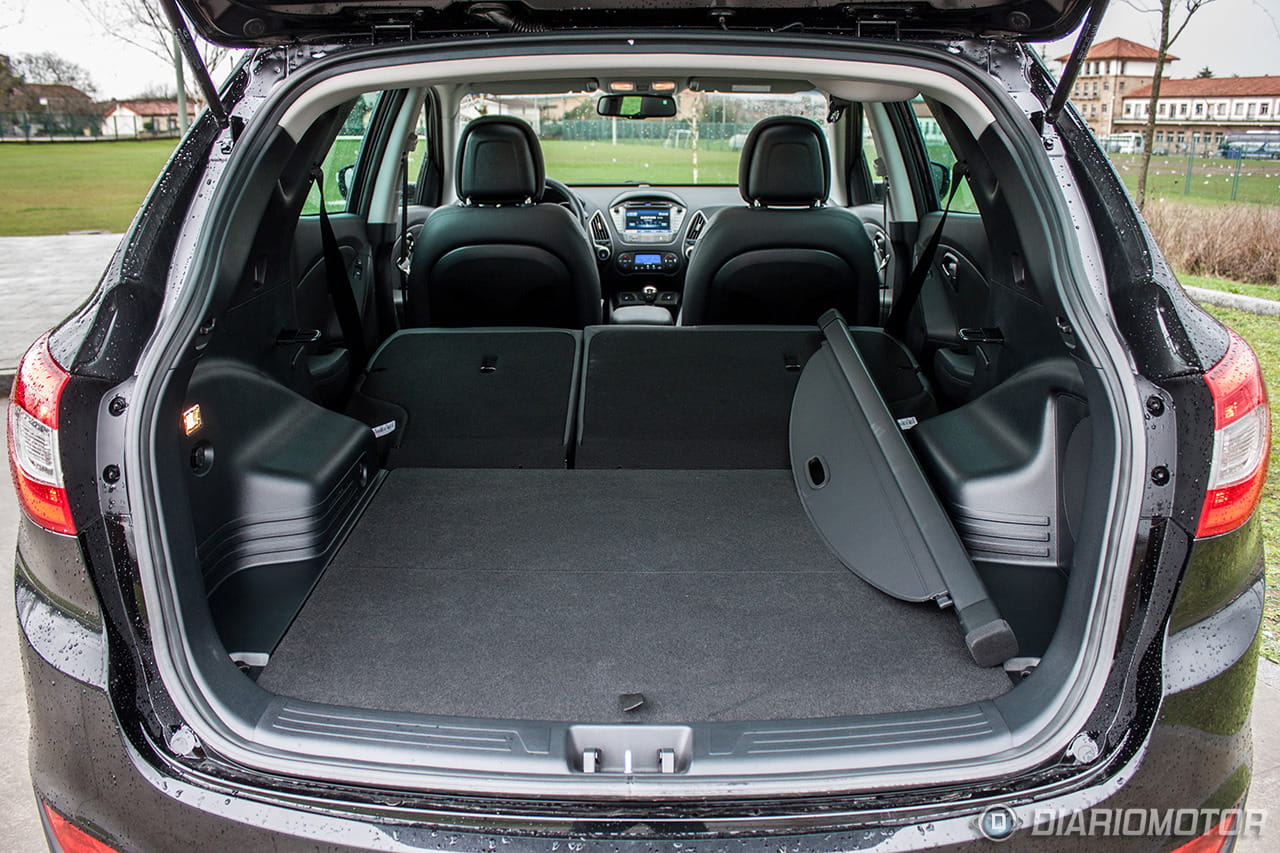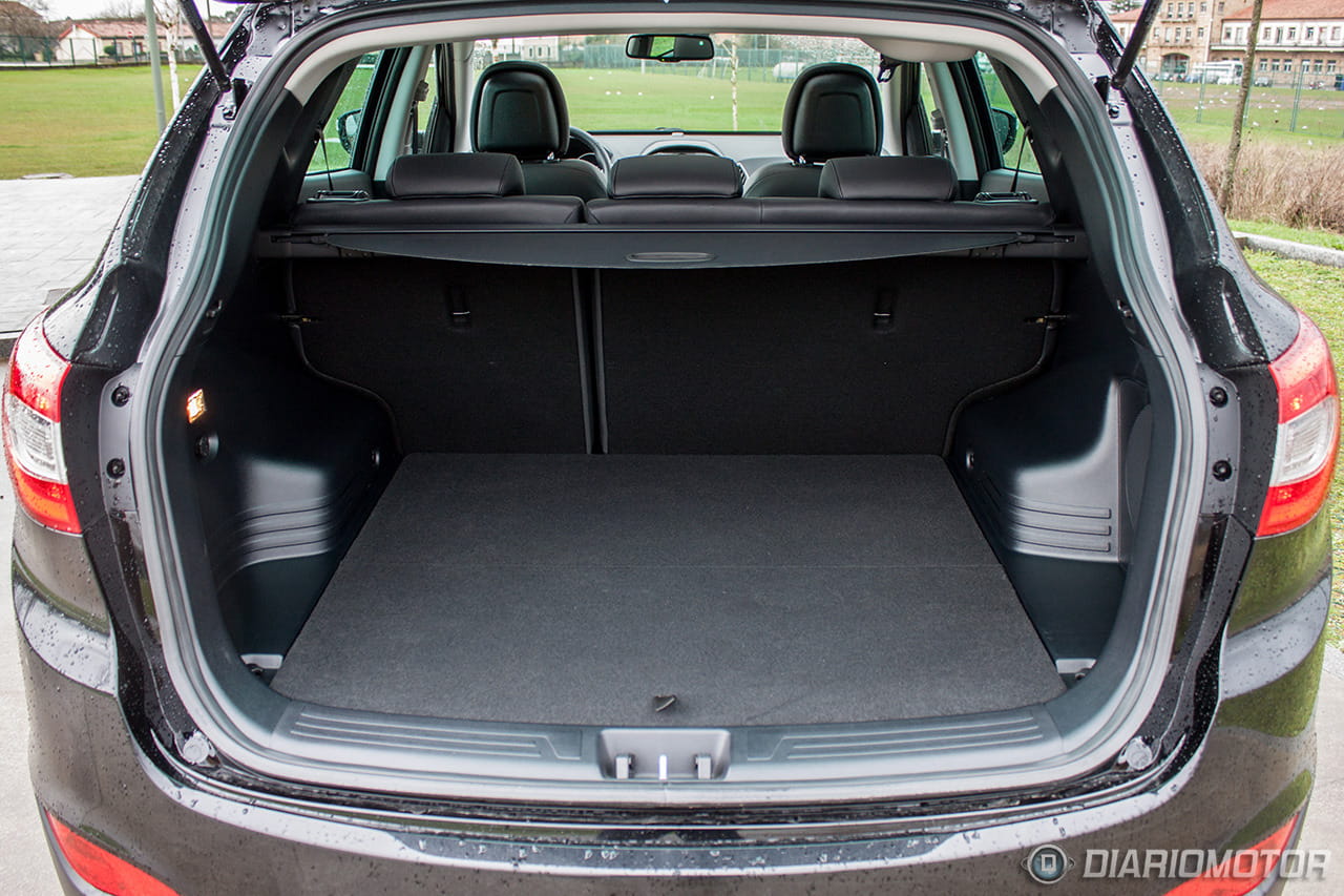 Ahora bien, la fila no es tan ancha como parece, dos adultos viajarán de película, tres adultos irán muy apretados a nivel de hombros. Por supuesto, las puertas cuentan con espacio para botellas grandes y el reposabrazos central con espacio para dos latas/botellas. La visibilidad hacia fuera para los pasajeros no es la mejor, pero la cintura ascendente acentúa la sensación de protección. El maletero del Hyundai ix35 tiene 465 litros de capacidad. Es una cifra buena pero hay rivales de su categoría con mayores maleteros, como por ejemplo el Dacia Duster. Las formas son regulares y muy bien aprovechables, permitiendo una superficie de carga casi plana al abatir la banqueta trasera.
