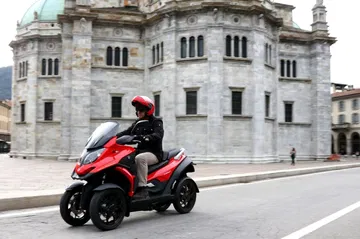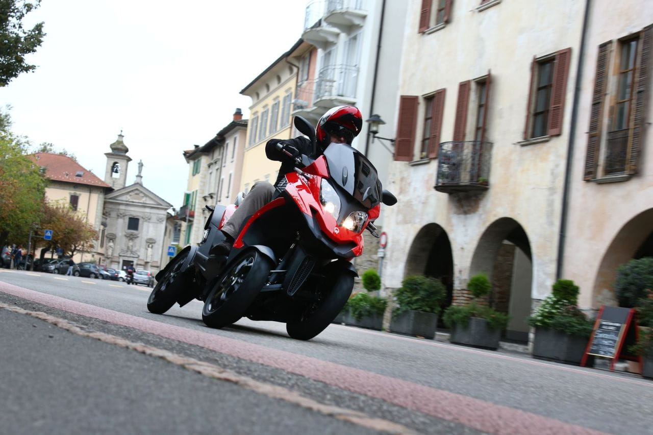 Un scooter de gran tamaño al que le han crecido dos ruedas más. Un chasis de scooter al que se han agregado dos conjuntos de dos ruedas, con suspensión independiente, pero que aún basa su principio dinámico en la inclinación en curva. Es más, es capaz de inclinarse hasta los 45 grados, cosa de la que muchos maxi scooter no podrían presumir. Esta inclinación es posible gracias a lo que la marca denomina Hydraulic Tilting System, un sistema de inclinación con apoyo hidráulico que evitaría la caída lateral y asiste a la fuerza del propio piloto.