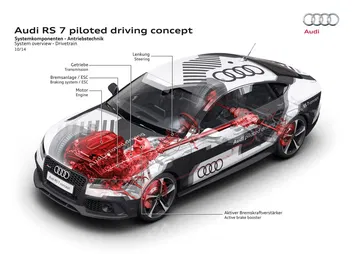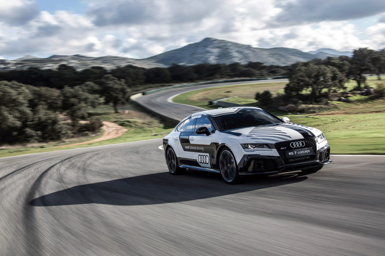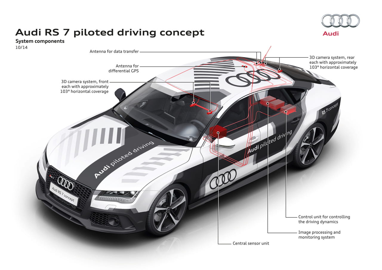 Un piloto no es aquel que solo sabe ir rápido y tomar correctamente todas las curvas, algo que al Audi RS7 autónomo se le daría especialmente bien. Este Audi RS7 sin conductor está dotado con un sistema de cámaras que cubre un ángulo de 103º en la frontal del habitáculo y otros 103º en la zaga, bastante más de lo que físicamente cualquier humano, salvo que tenga ojos en la nuca, sería capaz de cubrir. Este sistema es capaz de identificar objetos, como peatones, ciclistas y otros obstáculos, que se encuentren a 250 metros de distancia. También contaría con doce sensores ultrasónicos repartidos a lo largo de la carrocería. Para complementar esa información, contaría con una precisa localización vía satélite, mediante GPS y una cartografía del terreno, así como conexión permanente en internet. Hasta aquí nada sorprendente, esta tecnología ya está presente en muchos coches.