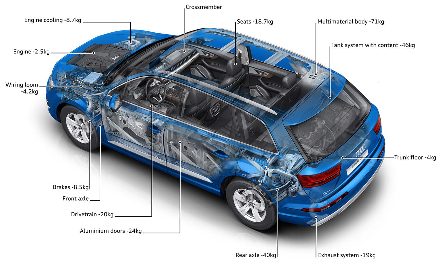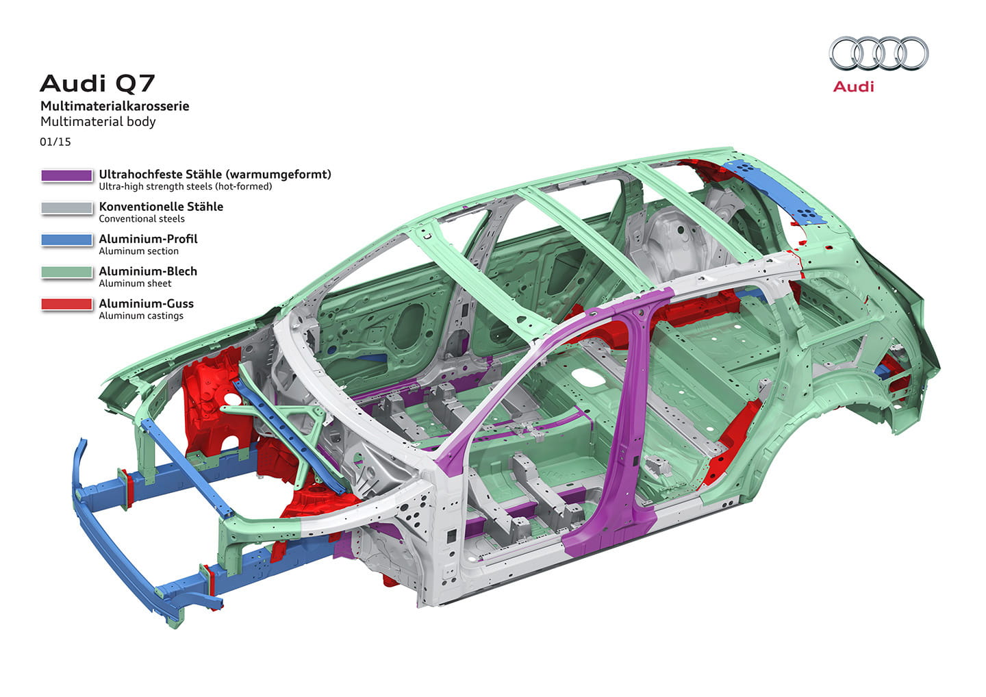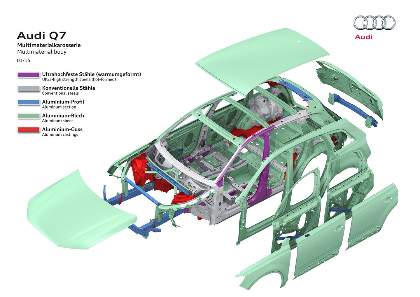 A diferencia de nosotros, los humanos, la delgadez no es una virtud deseable en un coche únicamente por estética, sino por prestaciones, agilidad y sobre todo prestaciones. Es por eso que todos los fabricantes buscan su dieta milagrosa, esa combinación de técnicas y materiales que les permita ahorrar el máximo precio sin un incremento excesivo de los costes, porque a menudo esas técnicas y esos materiales no son económicos. Y esa obsesión por el peso ha llevado a los de Ingolstadt a conseguir un ahorro de peso de hasta 325 kilogramos en el nuevo Audi Q7, con respecto a versiones equivalentes presentes en su predecesor. ¿Y en qué ha consistido esta dieta milagrosa?