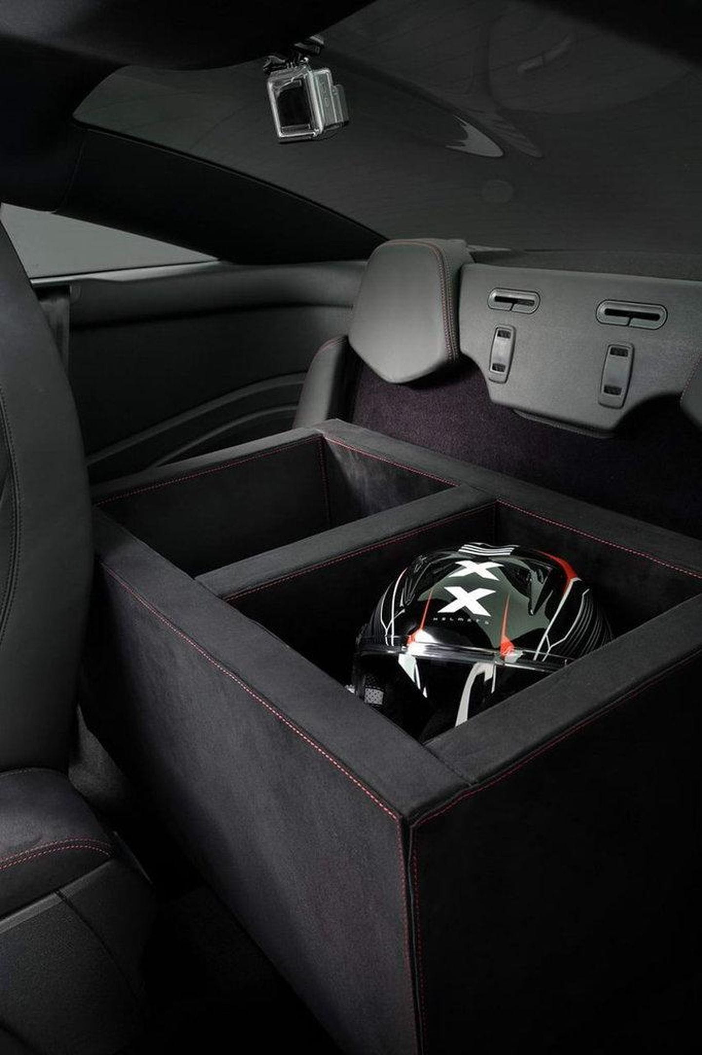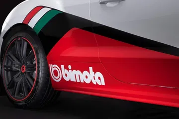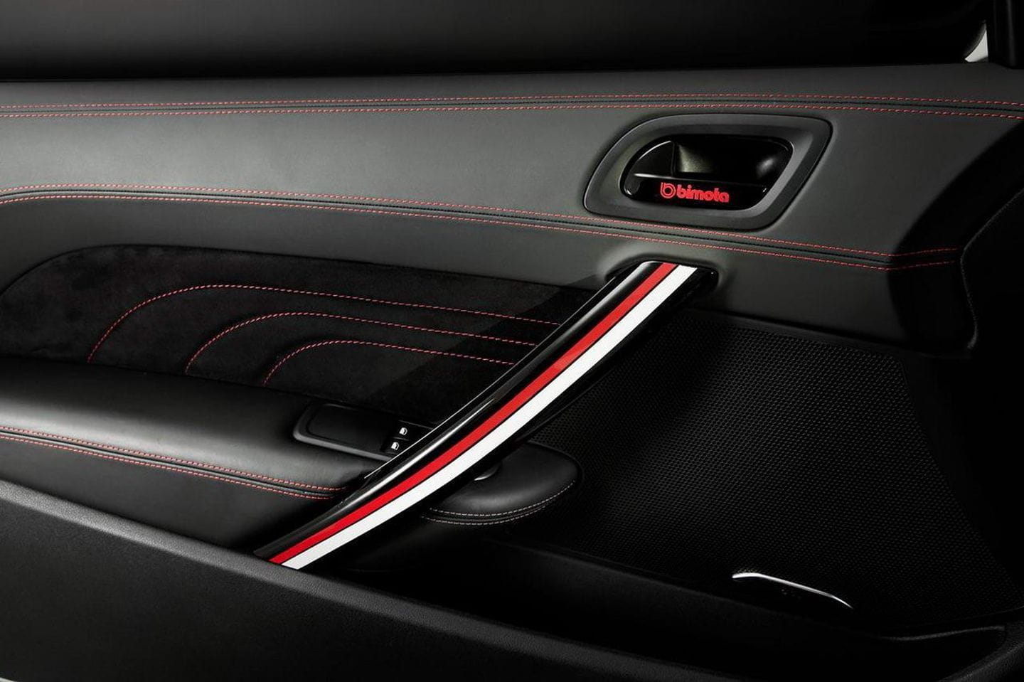 En el interior, todo es delicioso cuero Alcantara en color gris titanio. El paspuntado es en color rojo, al igual que lo son diferentes molduras, que subrayan la instrumentación, las formas del salpicadero, los asientos o la palanca de cambios. Los bacquéts deportivos también reciben el mismo tratamiento, y los tiradores de las puertas tienen el logotipo de Bimota impreso sobre ellos. Una pantalla de infoentretenimiento TomTom Bridge de 7 pulgadas reproduce en tiempo real las imágenes captadas por una cámara GoPro 4 camuflada en el paragolpes delantero, así como información del ordenador de a bordo e imágenes de una segunda GoPro que mira hacia atrás por la ventanilla trasera del coche.