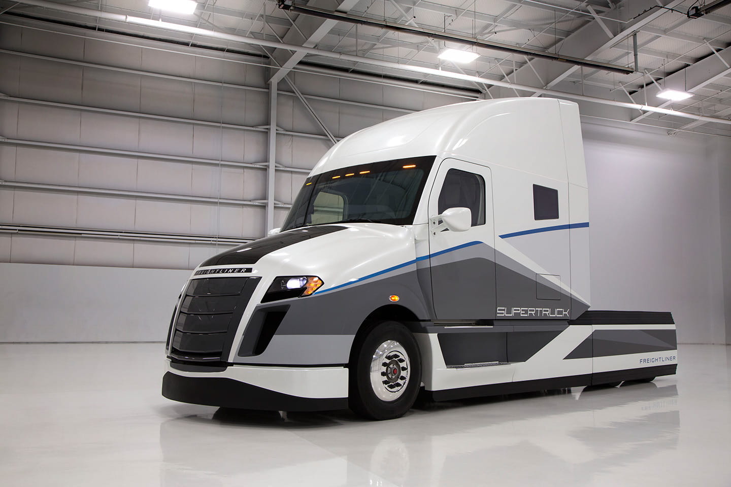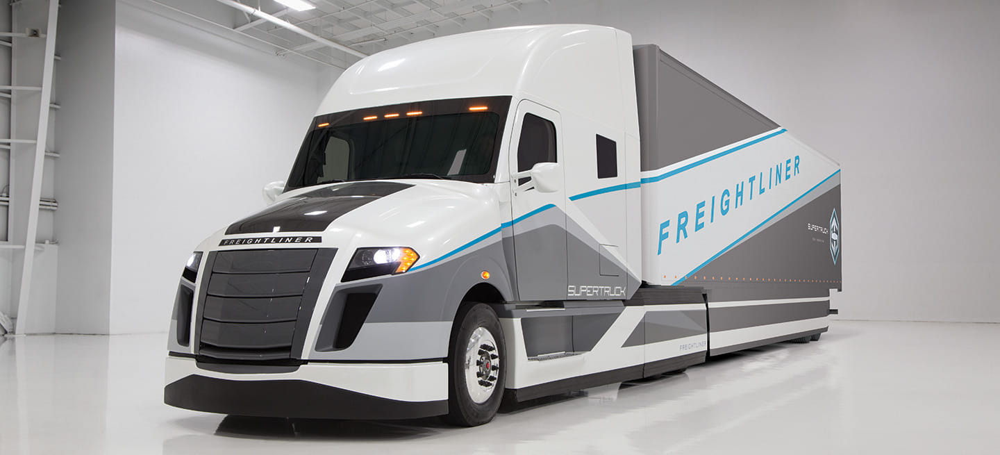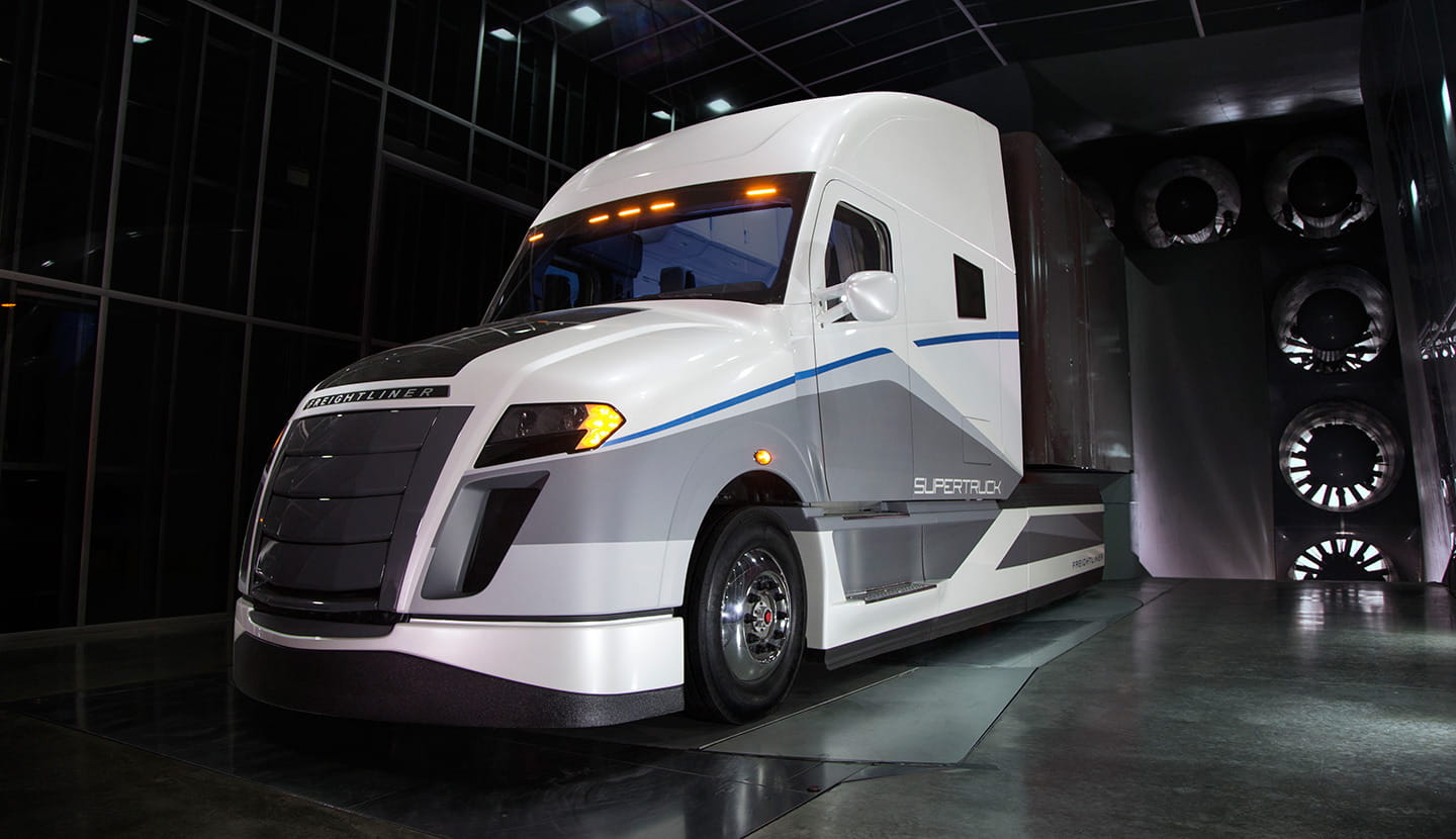 En esta bestia de carretera, con frontal prominente y voladizo delantero, lo que más destaca es un profundo trabajo aerodinámico que se aprecia en detalles que saltan a la vista, como su reducida altura, su parrilla cerrada y el contar con carenados para los pasos de rueda de todos sus ejes, salvo el delantero. Daimler asegura que su consumo, a 100 km/h, rondaría los 19 litros/100 kilómetros arrastrando 29,5 toneladas. Lo que supondría un ahorro de más de la mitad con respecto a los camiones que comercializaban en 2009, cuando el proyecto SuperTruck recibió luz verde.