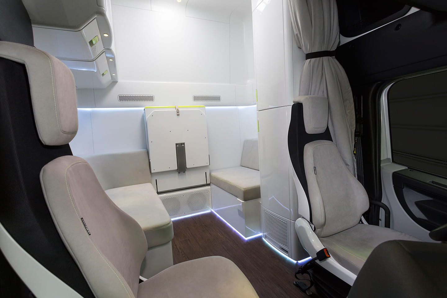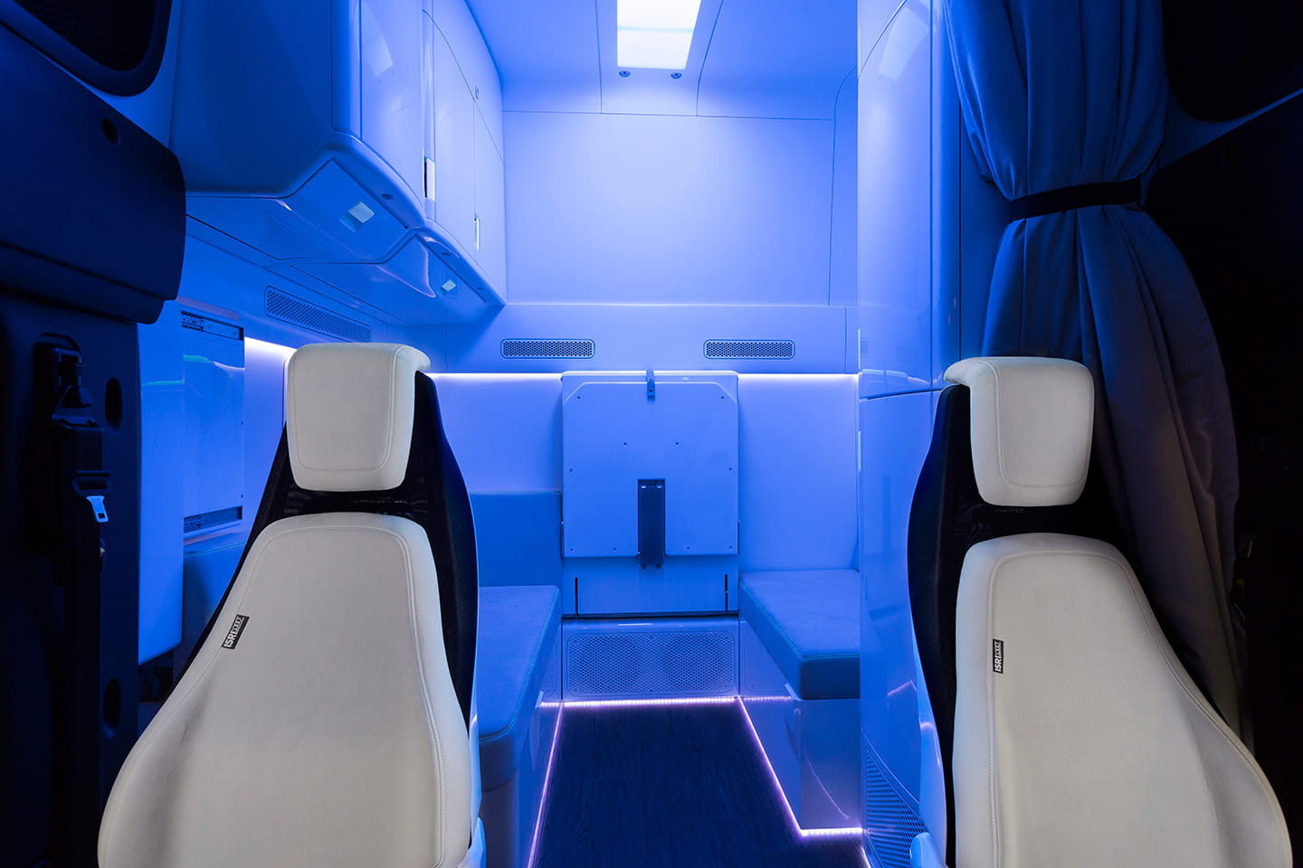 Si por fuera ya sorprende, el ambiente a bordo no es menos espectacular. Este prototipo cuenta con cómodos asientos para el conductor y su acompañante, y con una cabina bien preparada para pasar la noche con absoluto confort.