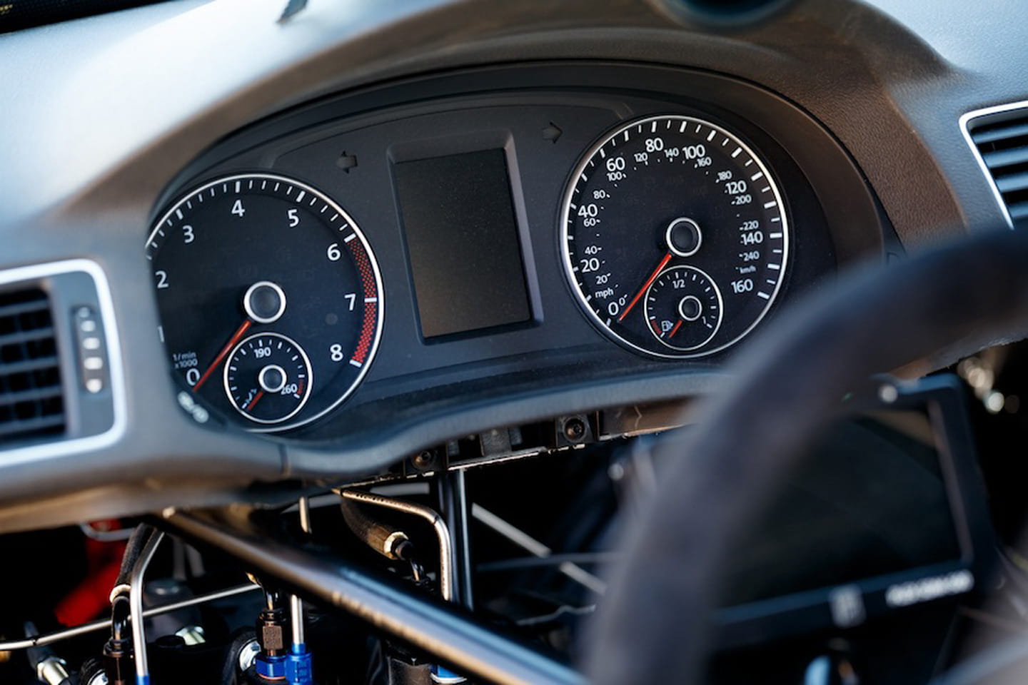 Hablamos de una gran preparación patrocinada por Rockstar Energy Drink, construida por el equipo Tanner Foust Racing y apoyada por Volkswagen. Piensa en un motor V8 que se estira hasta los 700 CV, y en los 200 CV restantes fruto de la inyección de óxido nitroso. Piensa en que entre su eje trasero y el cigüeñal se interpone un cambio G-Force GSR de cuatro velocidades de tipo dog-ring y un embrague de triple disco.
