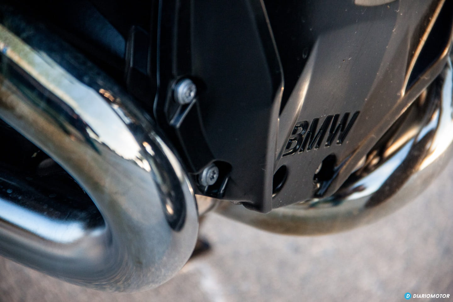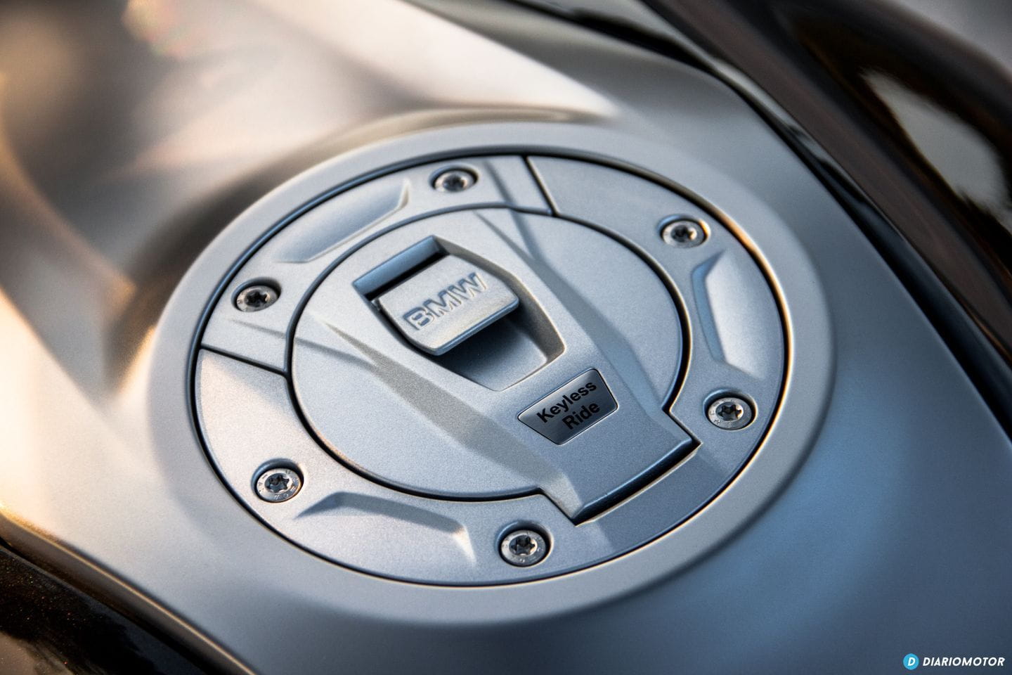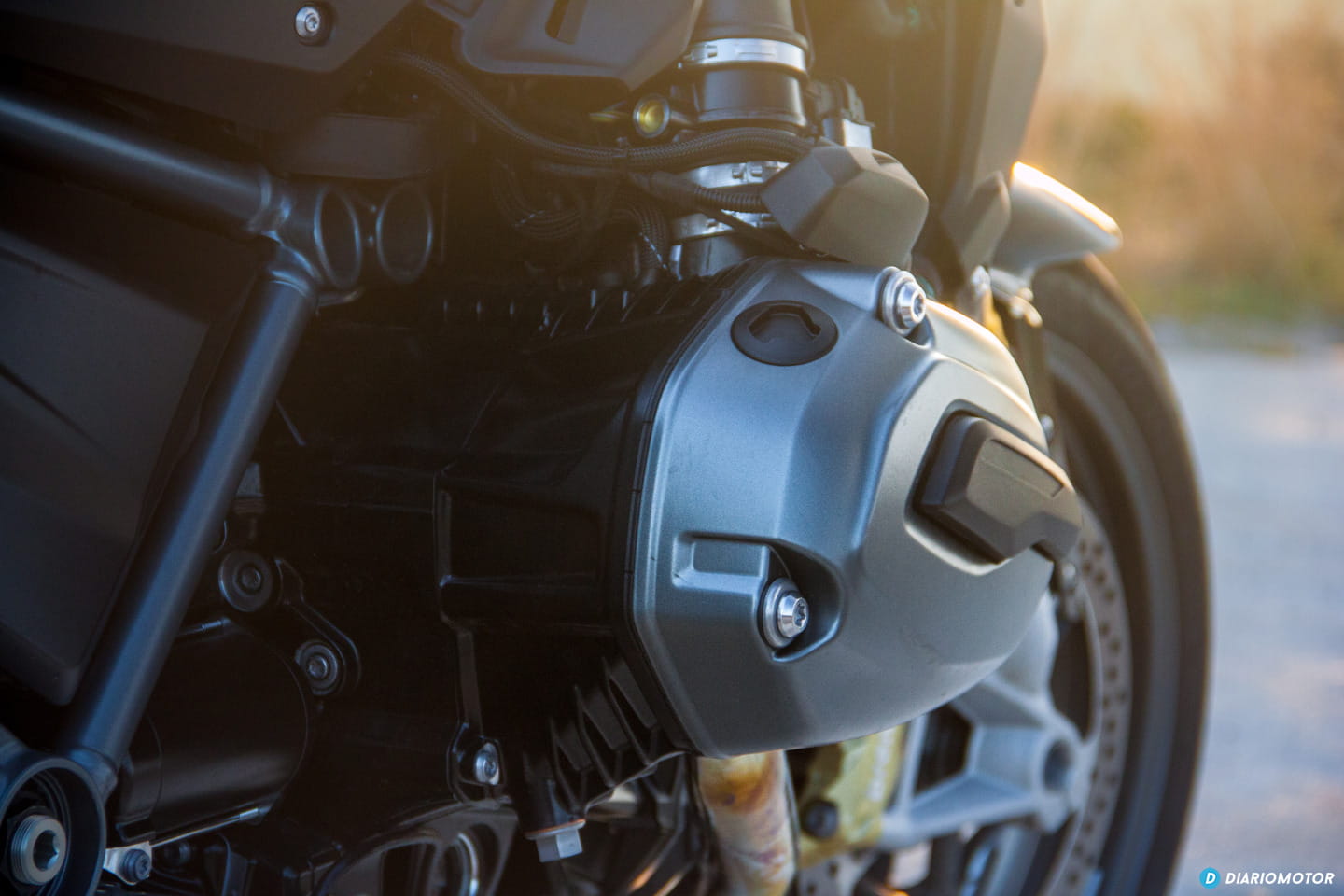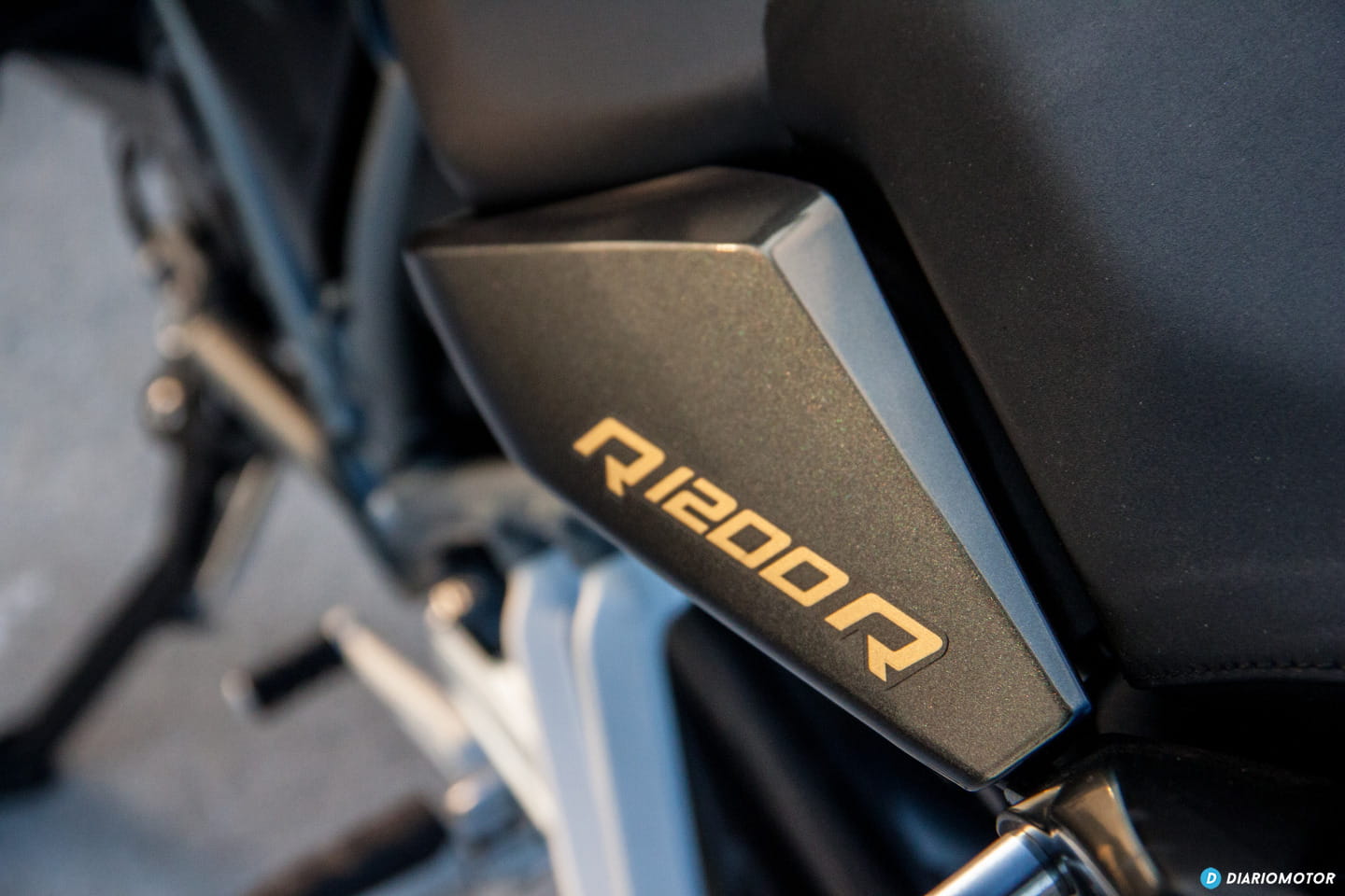 Metal visto y detalles como la tapa del depósito de combustible contribuyen a una imagen de solidez que también se percibe al tacto. Es una moto que transmite una sensación de alta calidad. Un detalle interesante es que el motor actúa como elemento autoportante en el chasis de doble viga: es parte del chasis y da rigidez al conjunto, no está simplemente montado en su interior. Este propulsor es el alma de esta naked: con 1.170 cc de cilindrada extraída de sólo dos cilindros desarrolla 125 CV a 7.750 rpm. Una cifra nada despreciable que toma un cariz mucho más serio al conocer su par motor: unos gigantescos 125 Nm a 6.500 rpm. Para que os hagáis una idea, es una cifra de par superior a la de una moto como la Yamaha YZF-R1 y una cifra de par motor comparable a la de un coche utilitario. El empuje de esta moto es realmente serio y es capaz de infundir mucho respeto. Y este par es necesario, ya que el motor debe tirar de los 231 kg que pesa la BMW R 1200 R.