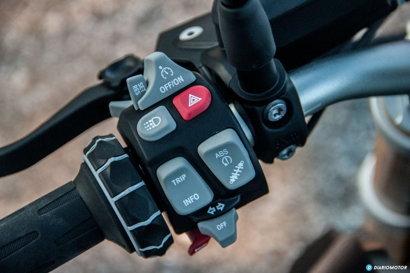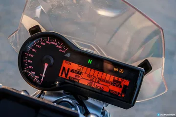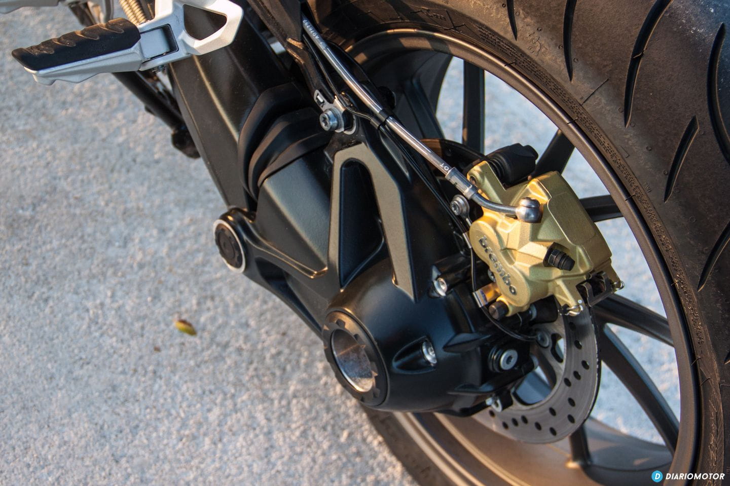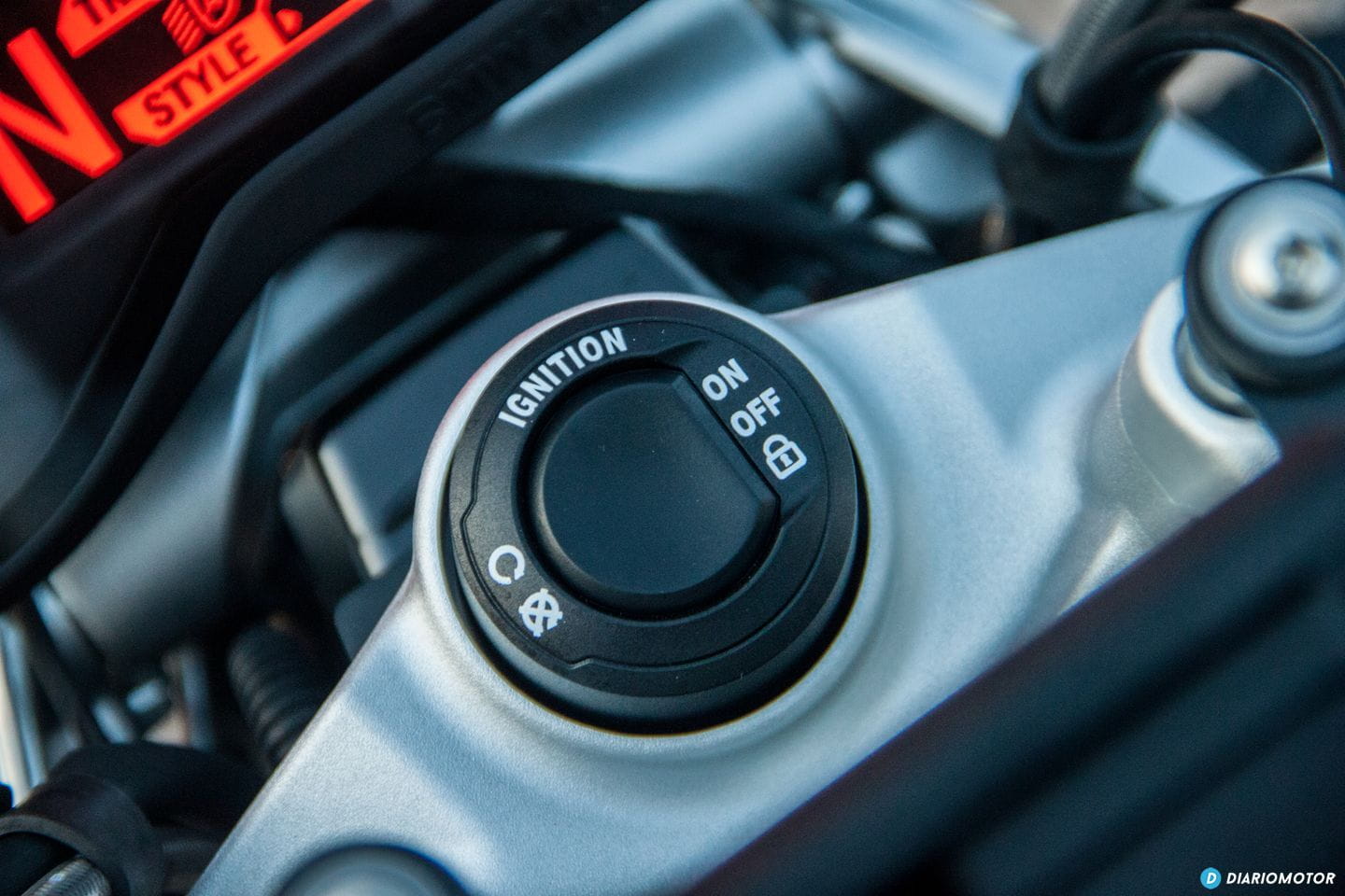 Metal visto y detalles como la tapa del depósito de combustible contribuyen a una imagen de solidez que también se percibe al tacto. Es una moto que transmite una sensación de alta calidad. Un detalle interesante es que el motor actúa como elemento autoportante en el chasis de doble viga: es parte del chasis y da rigidez al conjunto, no está simplemente montado en su interior. Este propulsor es el alma de esta naked: con 1.170 cc de cilindrada extraída de sólo dos cilindros desarrolla 125 CV a 7.750 rpm. Una cifra nada despreciable que toma un cariz mucho más serio al conocer su par motor: unos gigantescos 125 Nm a 6.500 rpm. Para que os hagáis una idea, es una cifra de par superior a la de una moto como la Yamaha YZF-R1 y una cifra de par motor comparable a la de un coche utilitario. El empuje de esta moto es realmente serio y es capaz de infundir mucho respeto. Y este par es necesario, ya que el motor debe tirar de los 231 kg que pesa la BMW R 1200 R.