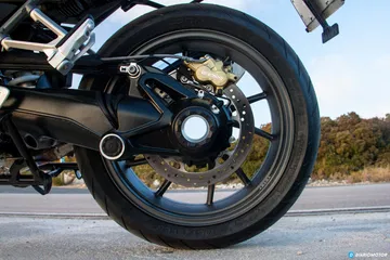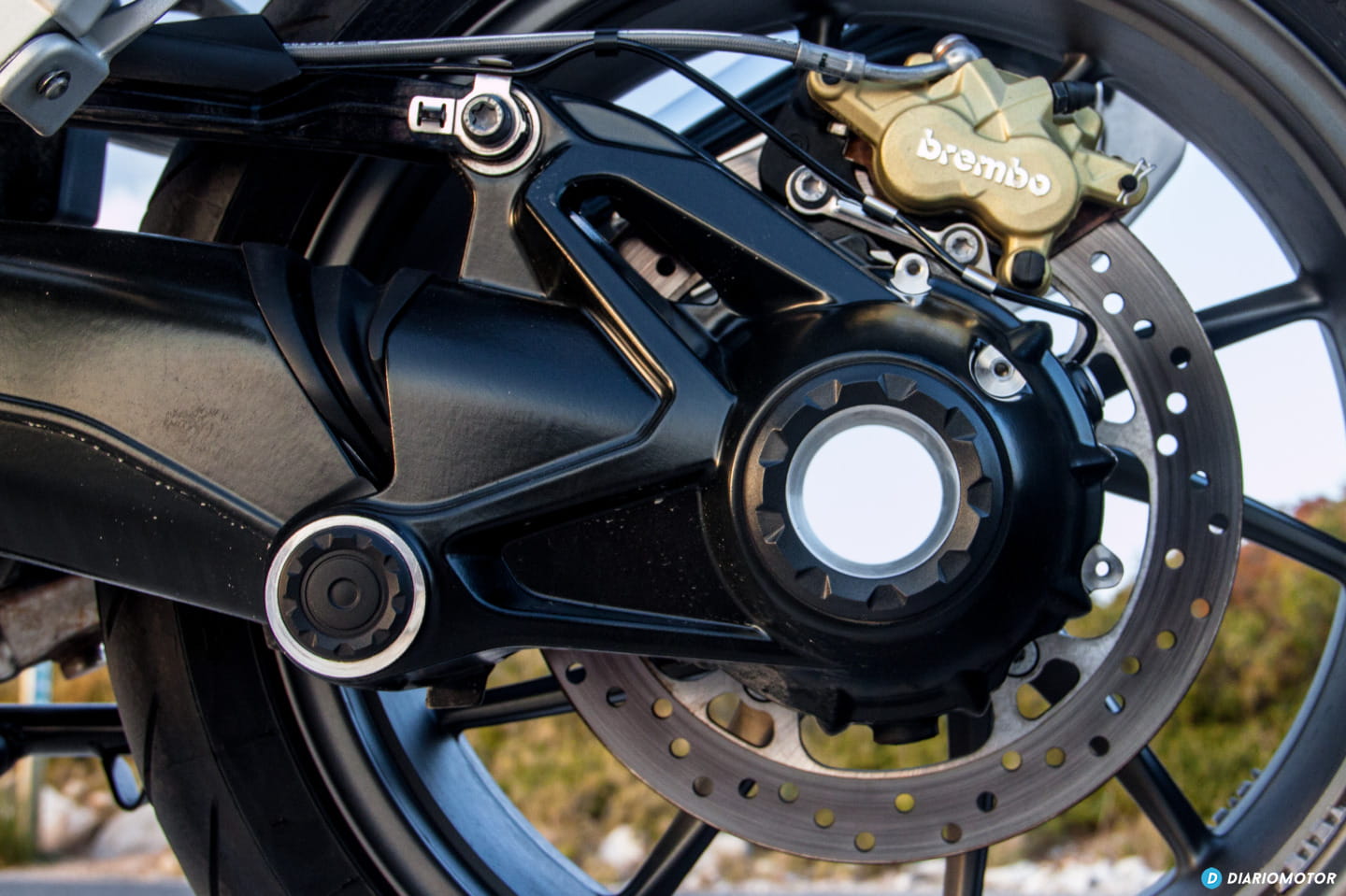 La transmisión de potencia a la rueda trasera – de generosas dimensiones, con un neumático de 185 mm de sección envuelto en una llanta de 17 pulgadas – se realiza mediante una caja de cambios de seis relaciones. Al contrario que la mayor parte de naked deportivas, la rueda recibe la fuerza del motor mediante un cardán en vez de la típica cadena metálica. El cardán es un mecanismo similar al diferencial de un coche, donde un eje dentado es el que transmite la fuerza a la rueda. Es un mecanismo más caro, pesado y complejo que la cadena, pero con la ventaja de no requerir del mantenimiento constante de estas. Es habitual en motos de viaje o de turismo, que van a realizar muchos kilómetros y suelen montar motores de par elevado. El resto de la parte ciclo de la BMW R 1200 R es de alto nivel: la horquilla invertida delantera de 45 mm y el basculante Paralever con muelle único forman un esquema imbatible de eficacia probada desde hace lustros.