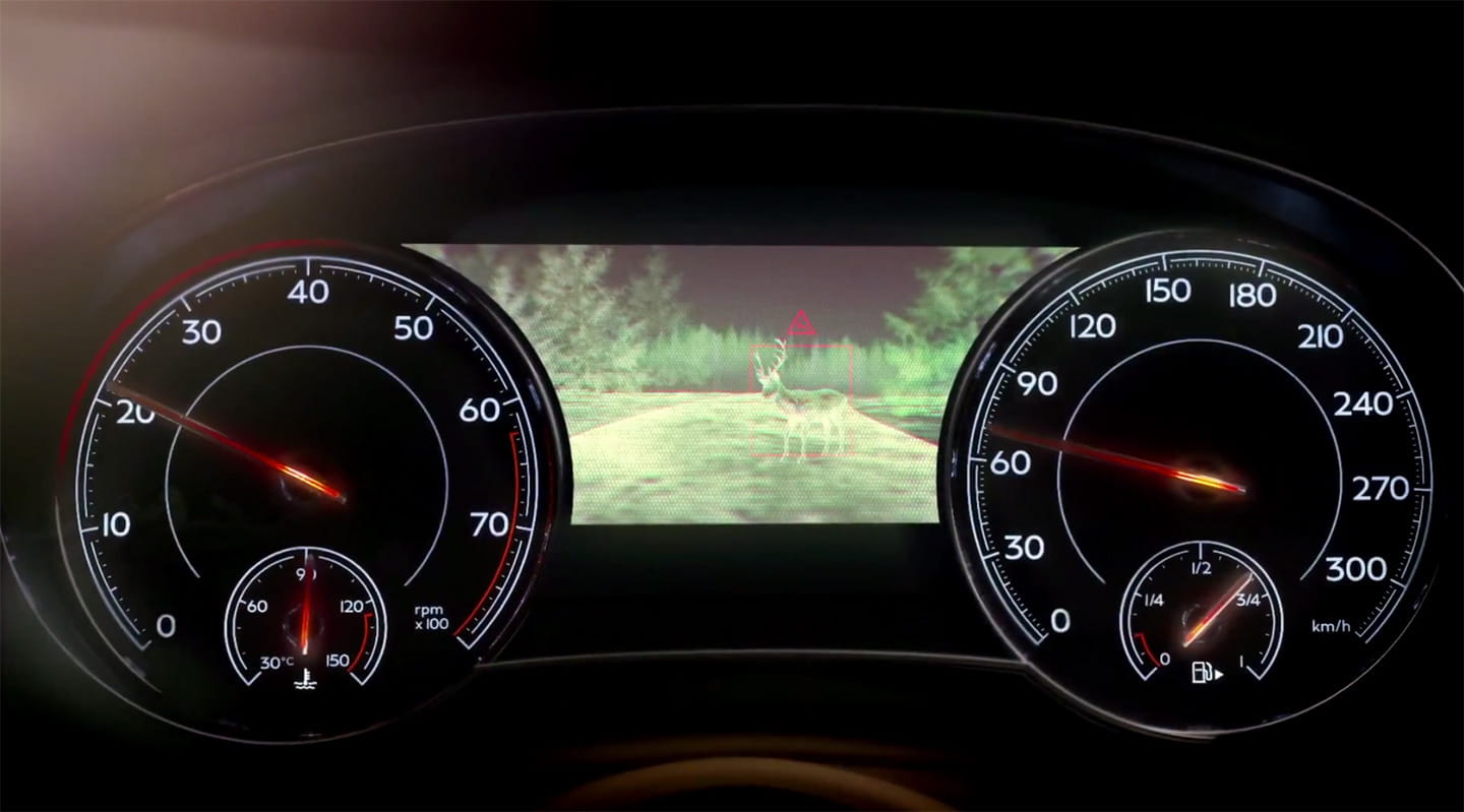 Un cuadro de mandos tradicional y elegante, pero atractivo visualmente. Con una gran superficie de pantalla en la que podremos ver, entre otras cosas, las imágenes de visión nocturna que recogerá el Bentley Bentayga de la carretera, con capacidad de interpretación para detectar peligros, como un ciervo en medio de la carretera.