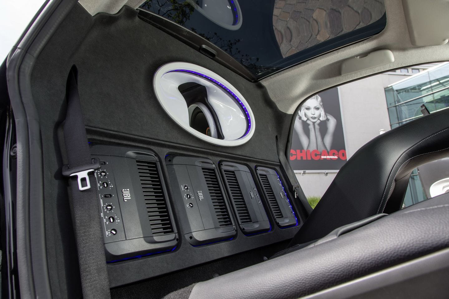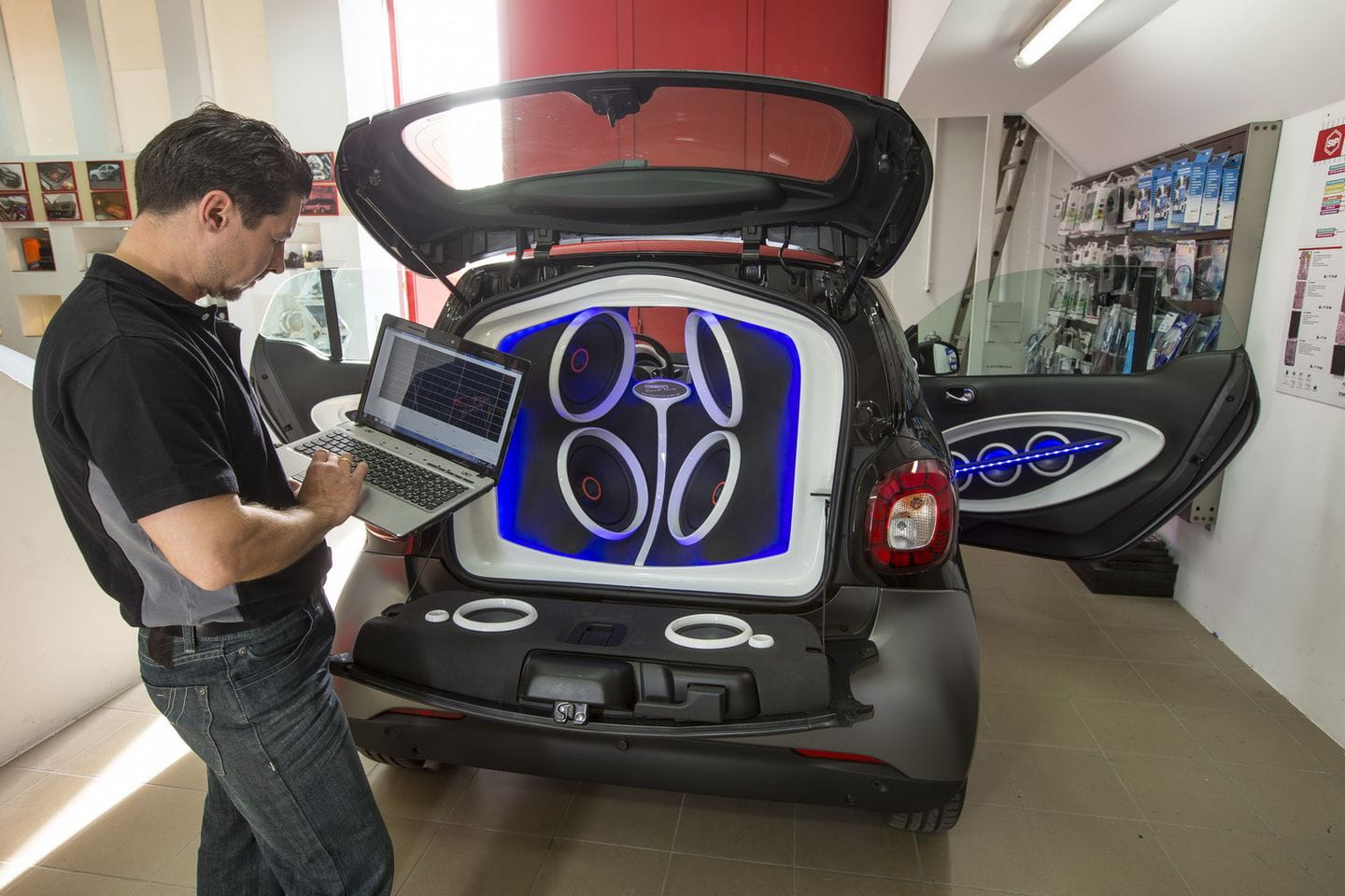 Sí, el smart sigue siendo un coche utilizable en el día a día, la preparación no anula ningún sistema básico del coche, aunque sí es cierto que nos quedamos sin maletero y el peso del coche puede tranquilamente haber aumentado en unos 100 kilos. El alma de este smart forgigs – juego de palabras que quiere decir «smart para conciertos» – son cinco amplificadores: tres unidades JBL GTO 804 EZ para los altavoces de medios y agudos, y dos JBL GTO 751 EZ para los subwoofers. Estos amplificadores alimentan un total de 16 altavoces y dos subwoofers.