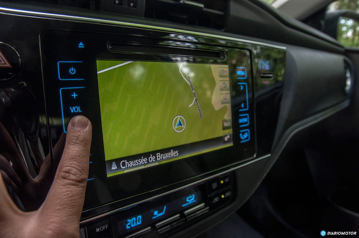 Pero sin lugar a dudas lo más destacado de este Toyota Auris 2015 es la incorporación de un nuevo equipo de entretenimiento más avanzado, con una pantalla a color. Toyota ha optado por un equipo de entretenimiento completamente táctil, sin más interfaces que aprovechen el uso de botones analógicos. Quizás no sea, y de hecho no lo es, la solución más efectiva por comodidad y precisión de los controles, pero sí que huelga decir que el hecho de haber integrado esta pantalla, con controles de iluminación azulada, ha cambiado por completo la apariencia del habitáculo y el salpicadero.