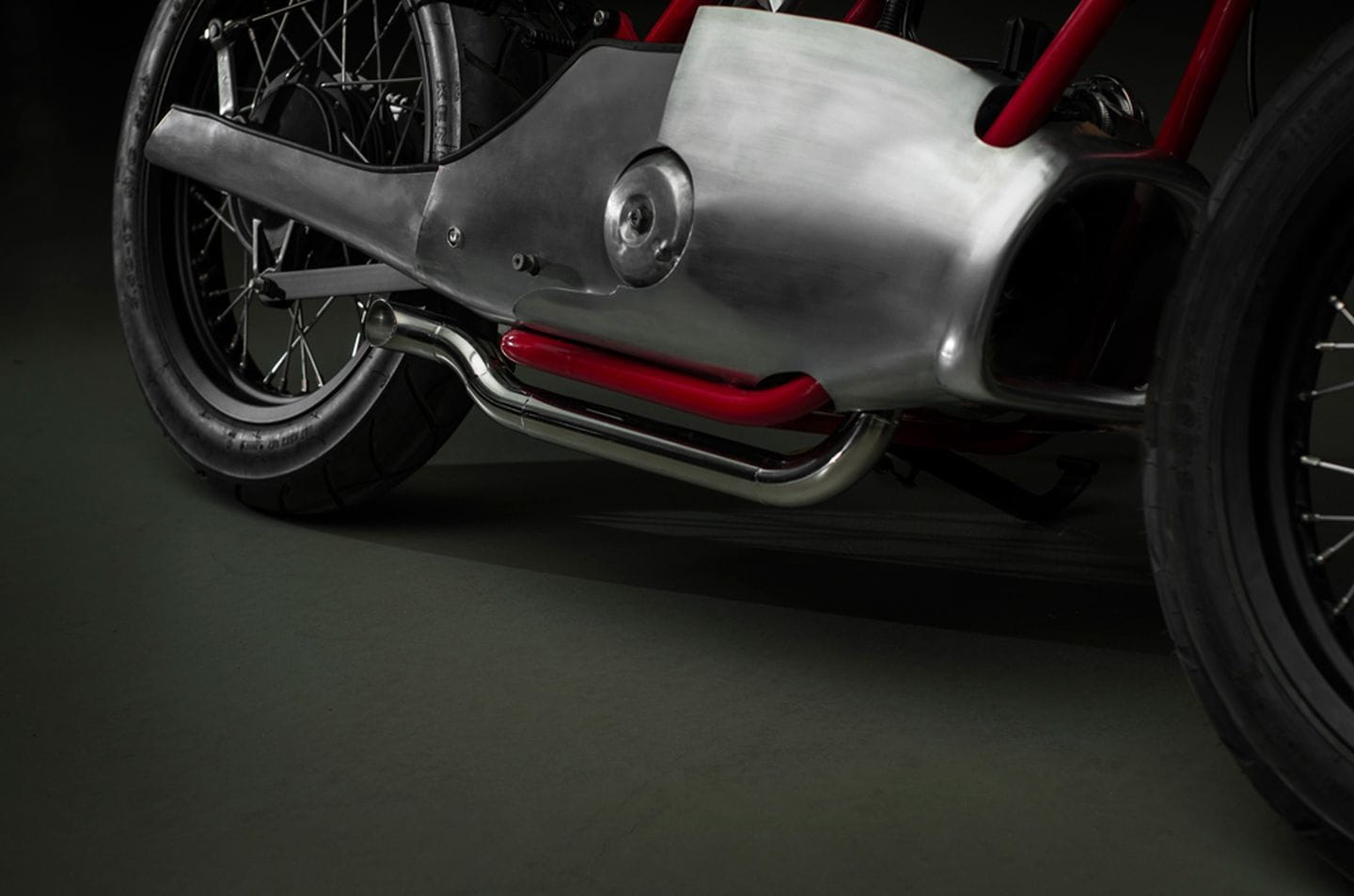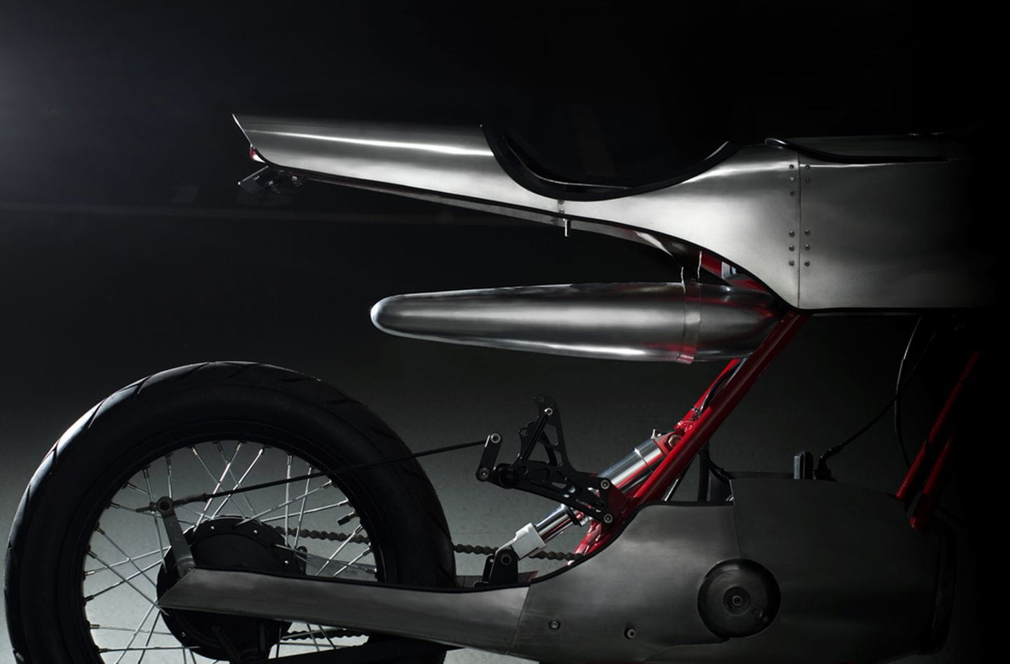 Suhann fue quién se encargó de crear la carrocería. Con madera creó los tres volúmenes de los que consta la moto. Después, montó sobre ellos paneles de aluminio que fueron clavados y moldeados a pleno martillazo. Puede sonar arcaico, pero era la técnica que se empleaba en los carrozados artesanales de coches como los Bugatti clásicos, sin ir más lejos. Fijaos en la preciosa forma del plano superior, o el depósito de combustible, situado en posición central. Sus formas son precisas, cuidadas, dando una sensación etérea.