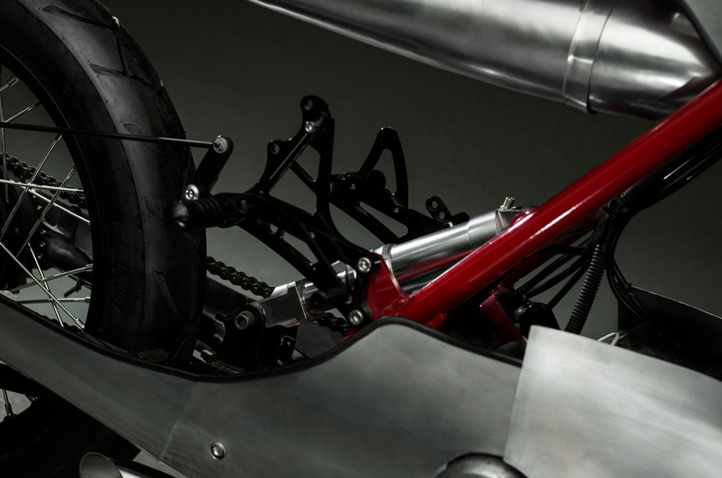 La parte baja de la moto es también una maravilla del diseño. La toma de aire para el motor es necesaria – es un motor refrigerado por aire – y es parte protagonista del conjunto. El tubo de escape asoma por debajo del módulo de aluminio, sin silenciador y de construcción artesanal: estoy seguro de que hará mucho ruido. Curiosa es la posición del pedal del freno trasero y la palanca de cambios, realmente elevadas. La pequeña talla de los taiwaneses y la postura de conducción café racer de esta moto permiten que sea asumible por parte del piloto.