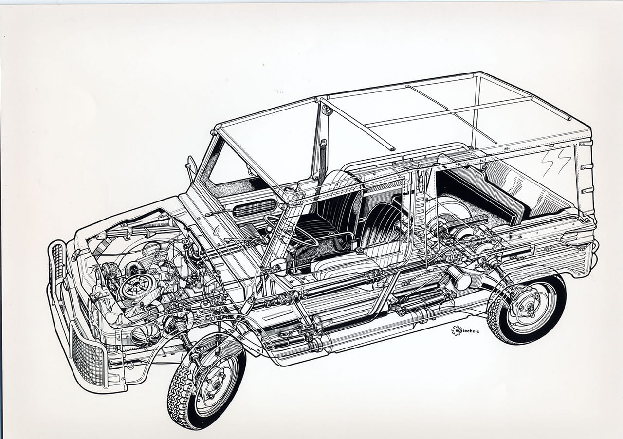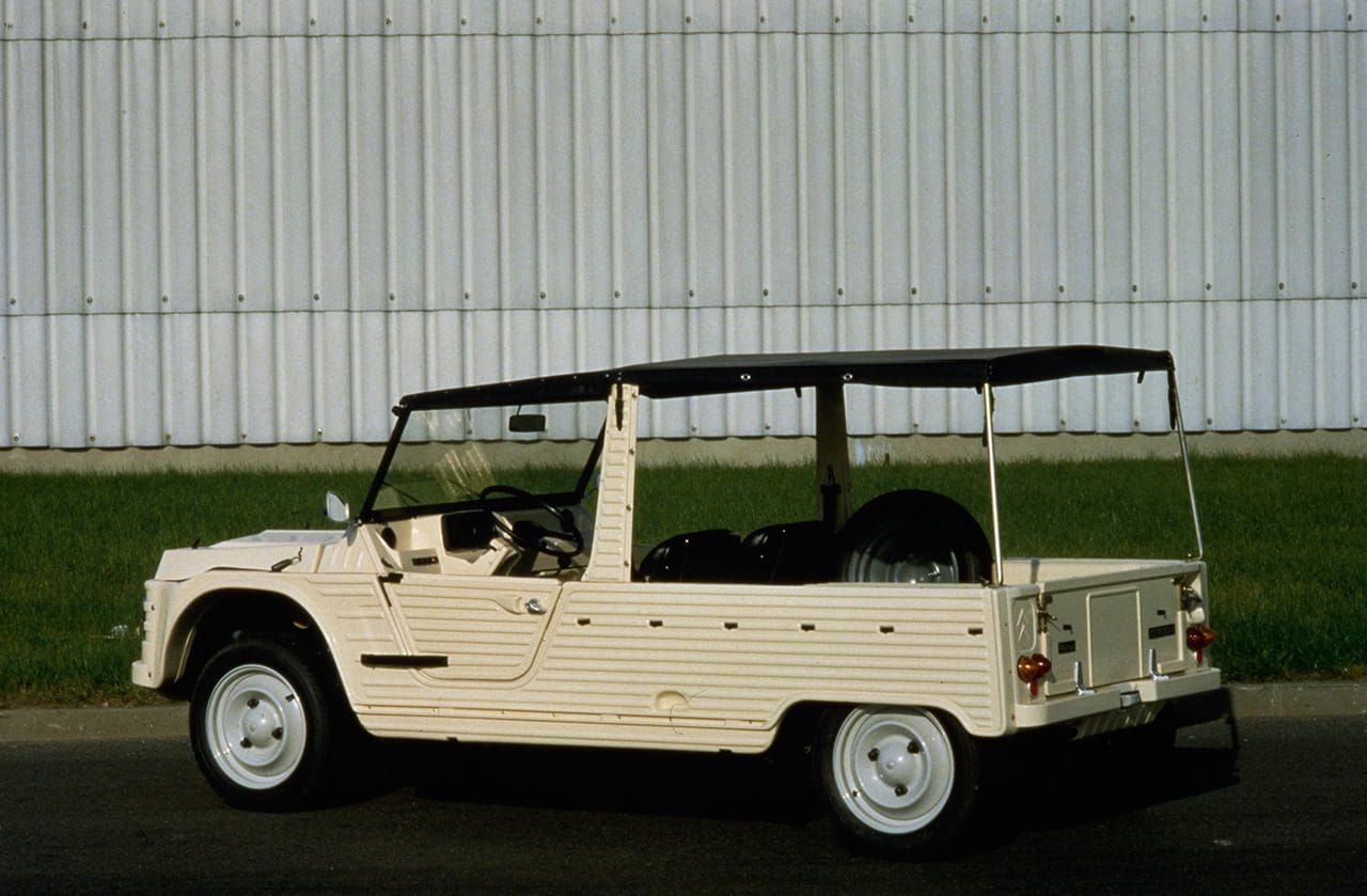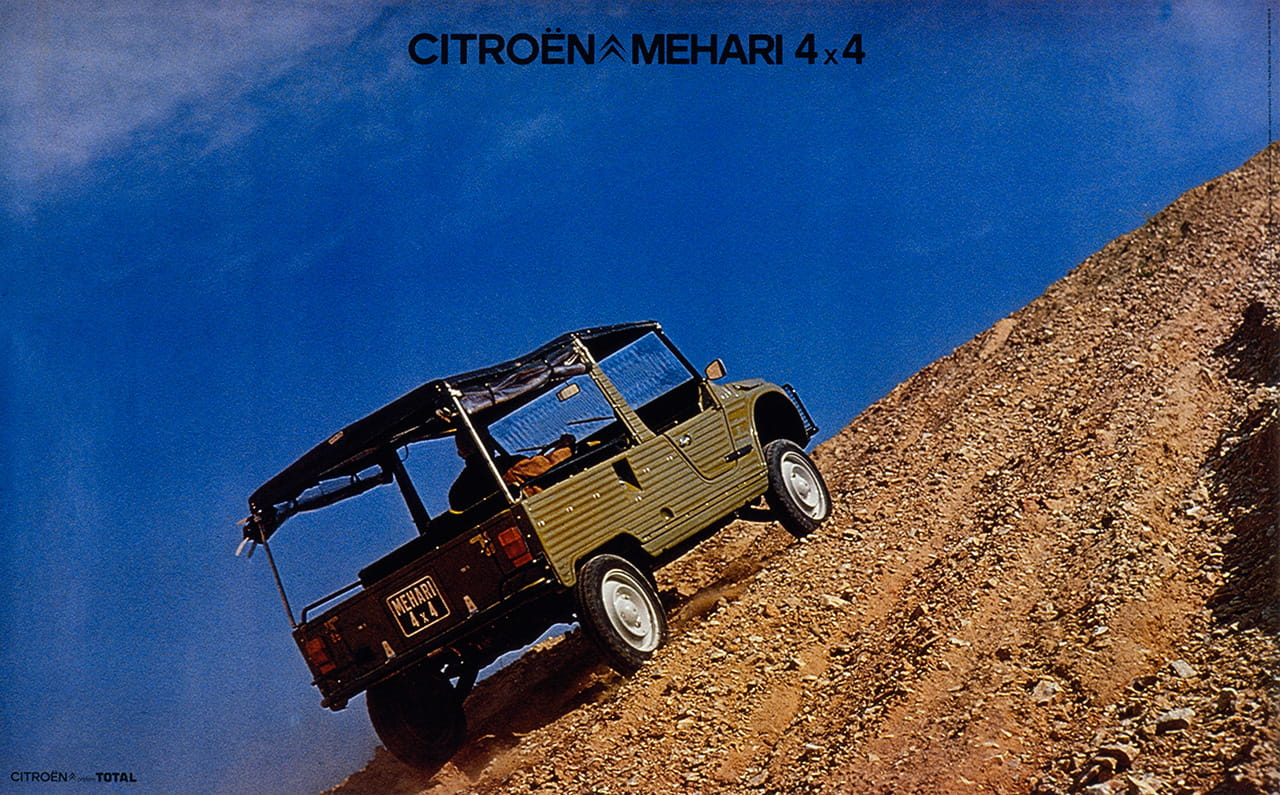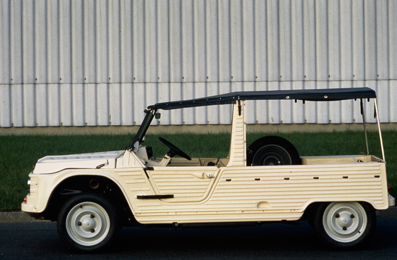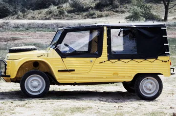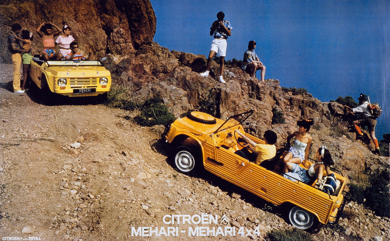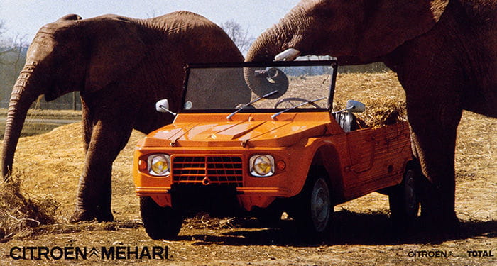 Recordad que el Mehari nacía en aquella época convulsa, la de mayo del 68 (ver artículo Citroën Mehari: 45 años del todoterreno de mayo del 68). El Mehari nacía del Dyane, que a su vez nació del 2CV, un modelo del que se construirían 150.000 unidades a lo largo de dos décadas. El Citroën Mehari se basaba en una filosofía minimalista y sencilla, buscaba ser versátil, pero ante todo económico. Se trataba de un modelo que, dentro de su sencillez, fue incluso innovador. Buena parte de su carrocería y su techo, se conformaron con plástico (ABS). De manera que el Mehari pesaba poco más de media tonelada.