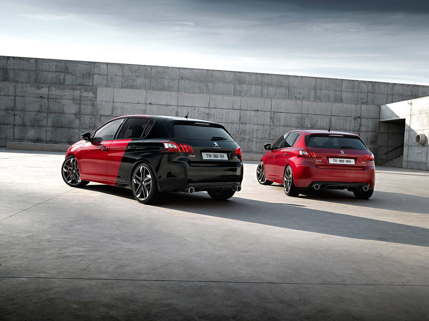Como puedes contemplar con más detalle en esta imagen, el Peugeot 308 GTI 270 estará disponible con el acabado Coupé Franche (izquierda), o en un único tono, entre los que se incluirán Ultimate Red (derecha), Magnetic Blue, Perla Nera Black, Artense Grey, Pearlescent White y Hurricane Grey.